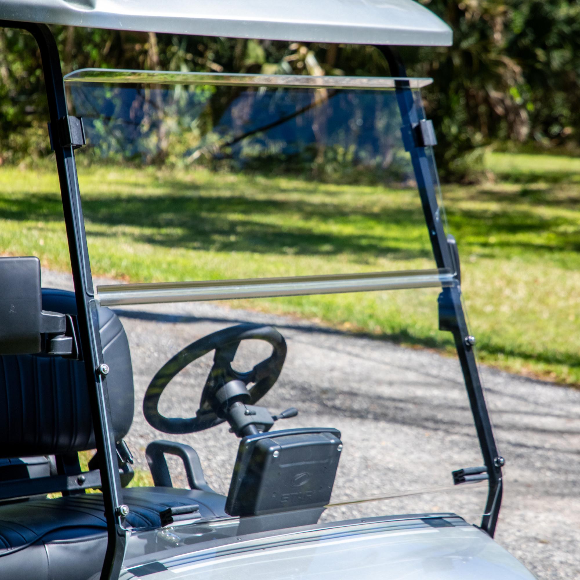 Upgrade your Star Capella golf cart with the folding windshield for year-round comfort and protection. Made from durable tinted acrylic, it reduces sun glare while providing excellent visibility. Its sturdy construction shields you from branches, rocks, and other debris. Enjoy an adjustable folding design that lets you customize your ride for any weather!