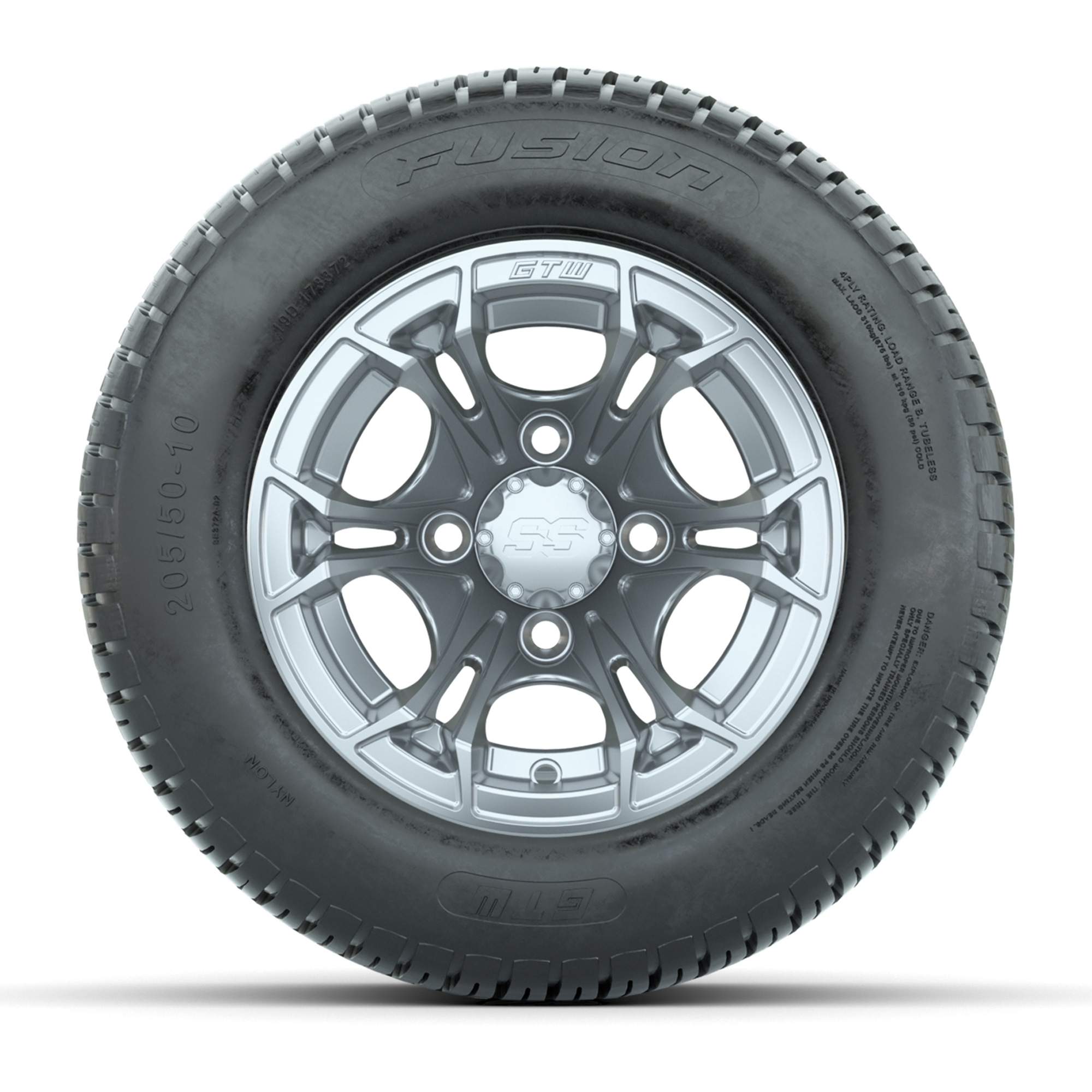 GTW Spyder Silver Brush 10 in Wheels with 205/50-10 Fusion Street Tires – Full Set