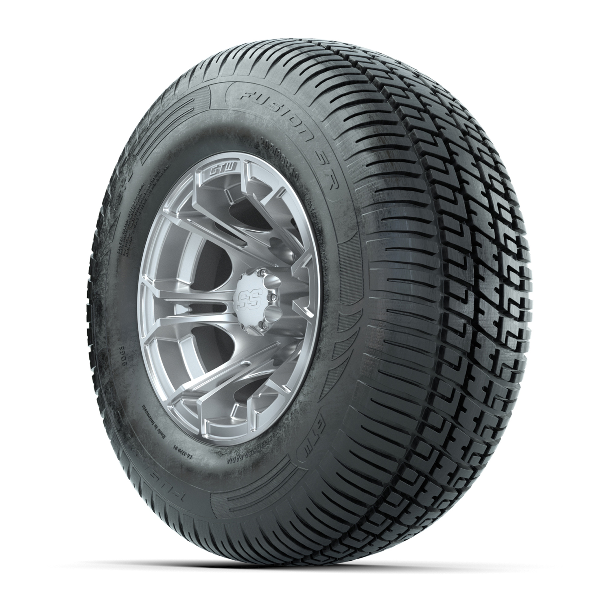 A set of (4) 10-inch GTW® Spyder Silver Brush golf cart wheels Mounted on 205/65-R10 Fusion SR Steel Belted Radial Tires