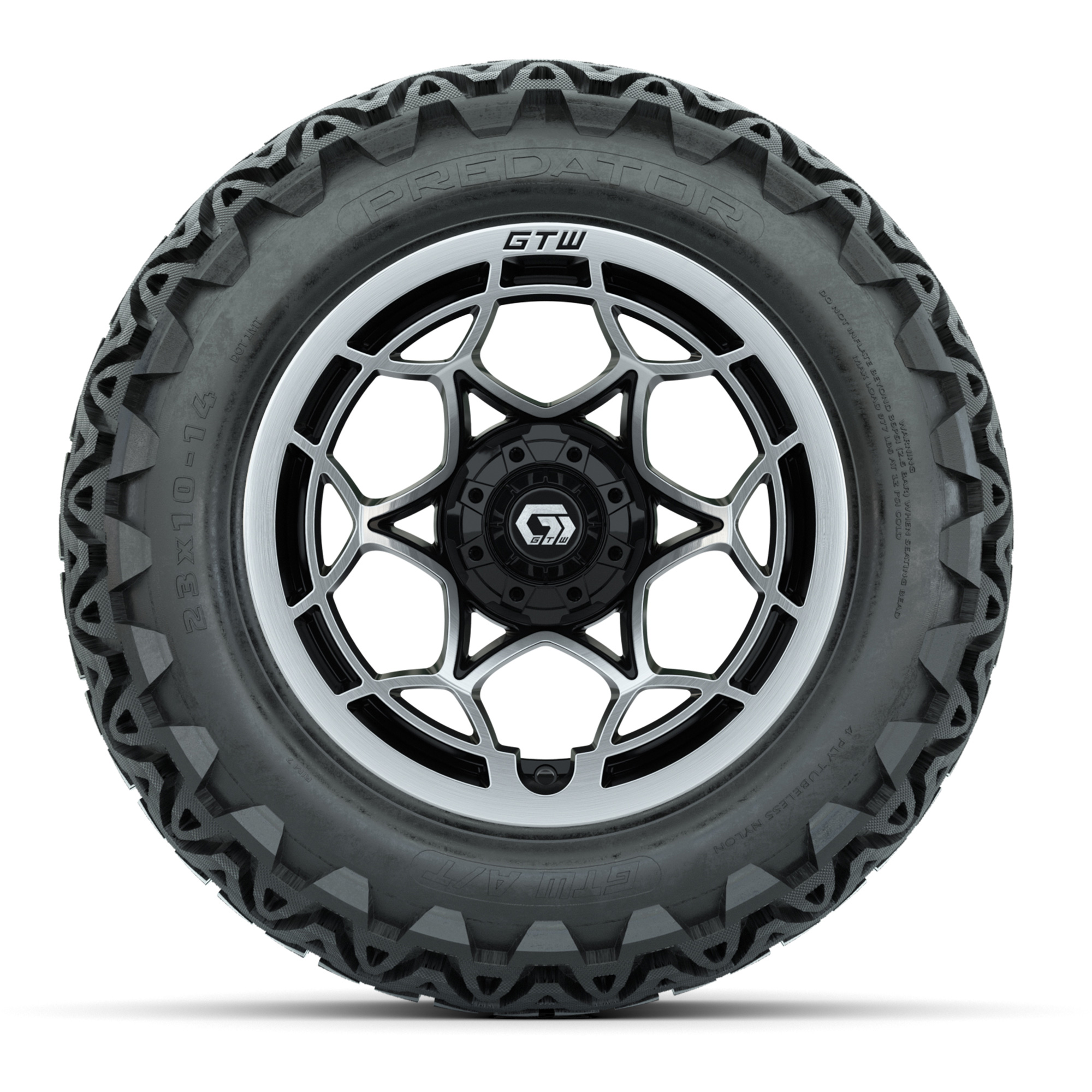 product GTW® Nexus Gloss Black/Silver 14 in Wheels with 23x10-14 Predator All-Terrain Tires – Full Set Item # A19-1208 Tread Classification:All-Terrain/Off-RoadFull kit includes:(4) 14” GTW® Nexus Wheels / Gloss Black/Silver Finish / Offset: 3:4 (ET -.25)(4) 23x10-14 GTW® Predator All-Terrain Tires / Tire is approx. 23” tall (4-Ply)(4) Color match capsLug nuts sold separatelyPlease Note: All Wheels are 4 on 4 Hole / Lug Pattern (4x101.6mm) unless otherwise specified.Tech Tips:We Recommend a Lift Kit for This Tire & Wheel KitTire & Wheel Combos are mounted and Inflated Before Shipping, Free of Charge Please Check and Adjust PSI in Tires Before Operation (Recommended Inflation Can Be Found on Sidewall of Tire)All Wheels Have a lug pattern of "4x101.6mm"Lug Nuts Sold Separately: Standard: #LUG4S (Standard Chrome Lug Nuts) Metric: #LUG4M (Yamaha Models) Find A Dealer