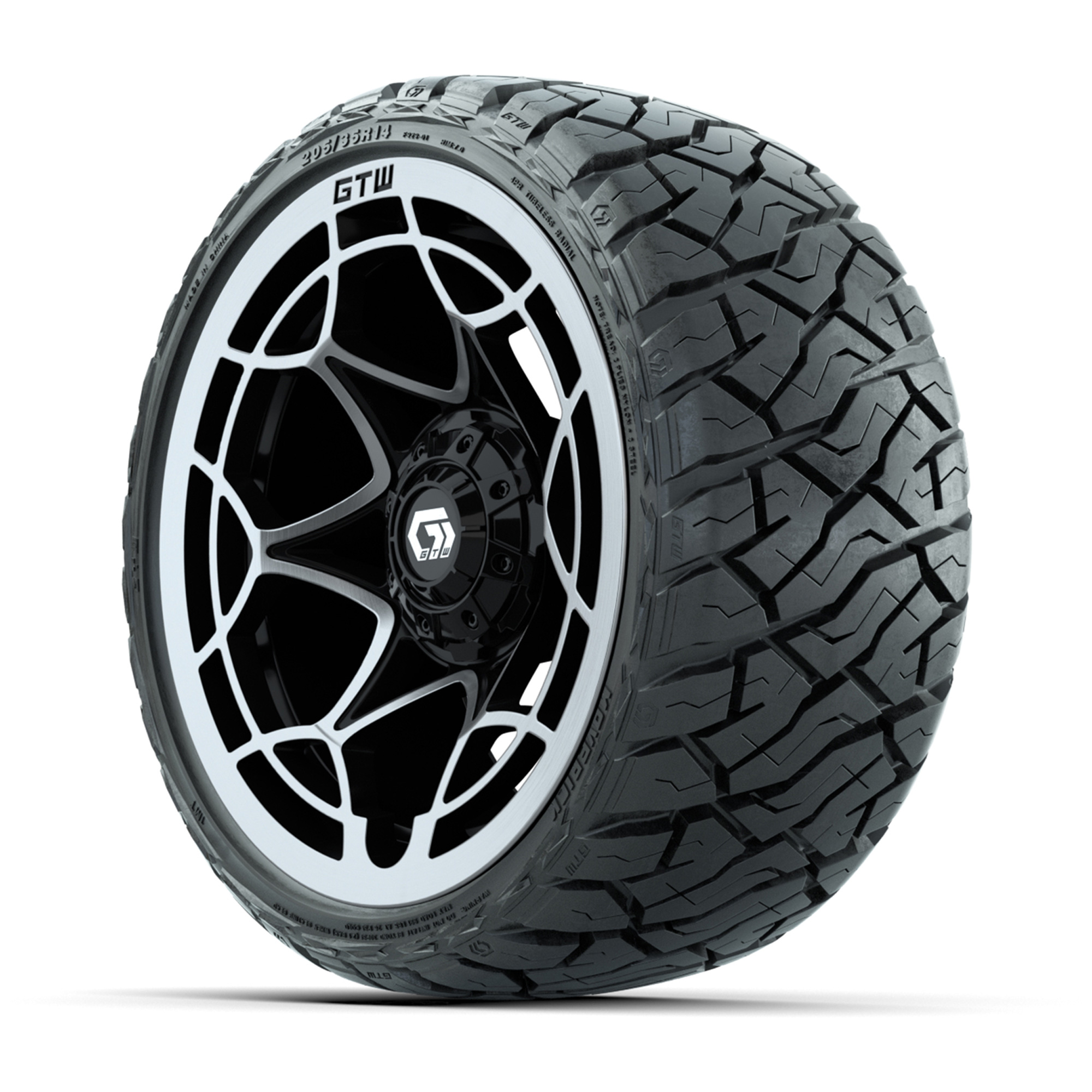 A set of (4) 14-inch GTW® Nexus Gloss Black/Silver golf cart wheels Mounted on 205/35-R14 Maverick Low-Profile All-Terrain Tires