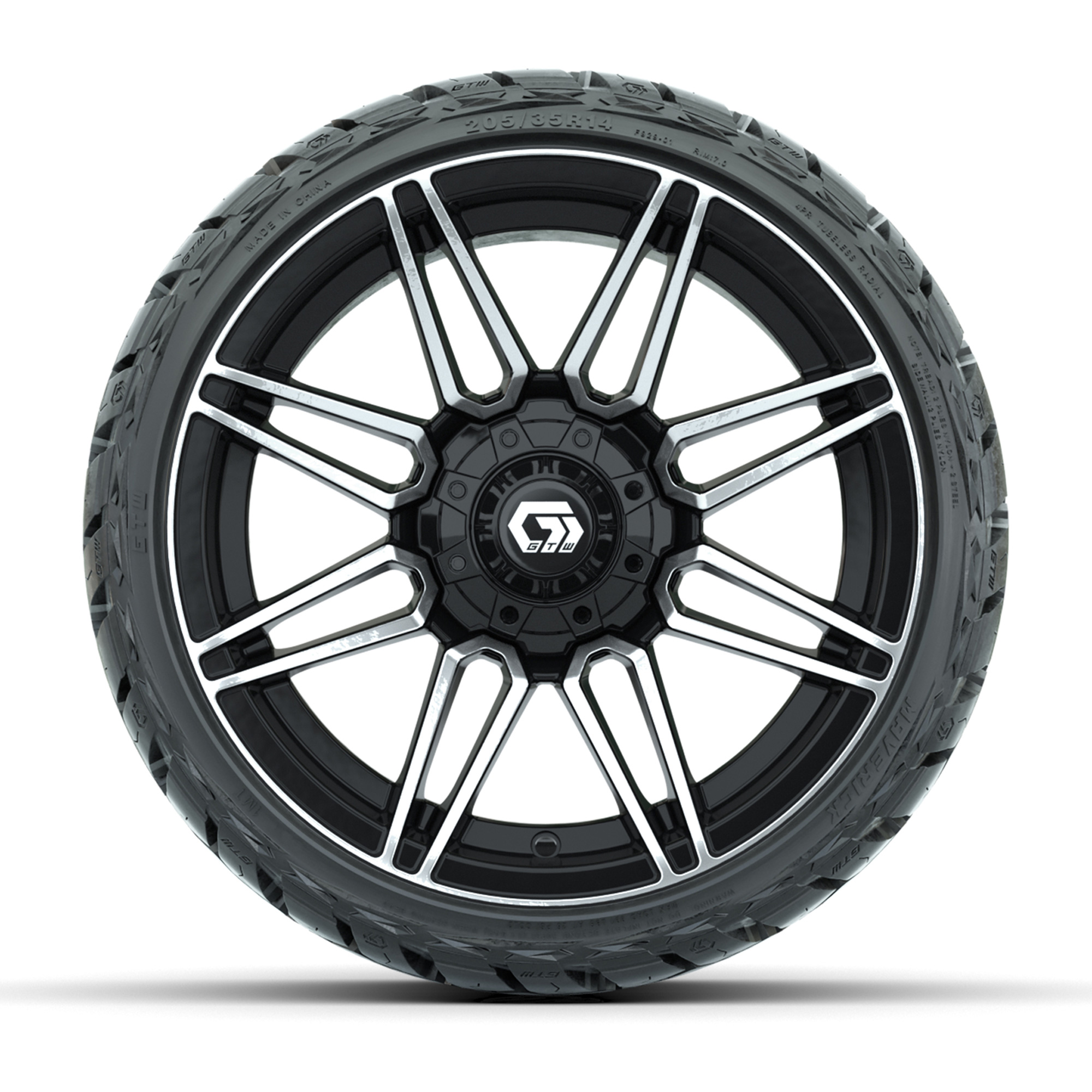 A set of (4) 14-inch GTW® Stealth Gloss Black & Machined golf cart wheels Mounted on 205/35-R14 Maverick Low-Profile All-Terrain Tires