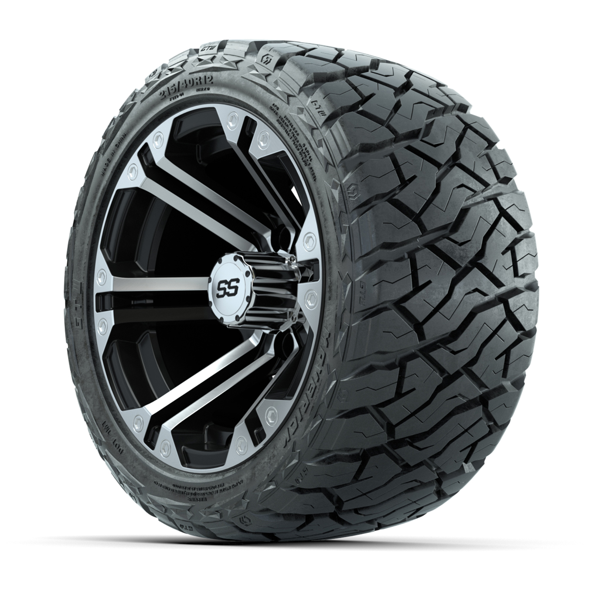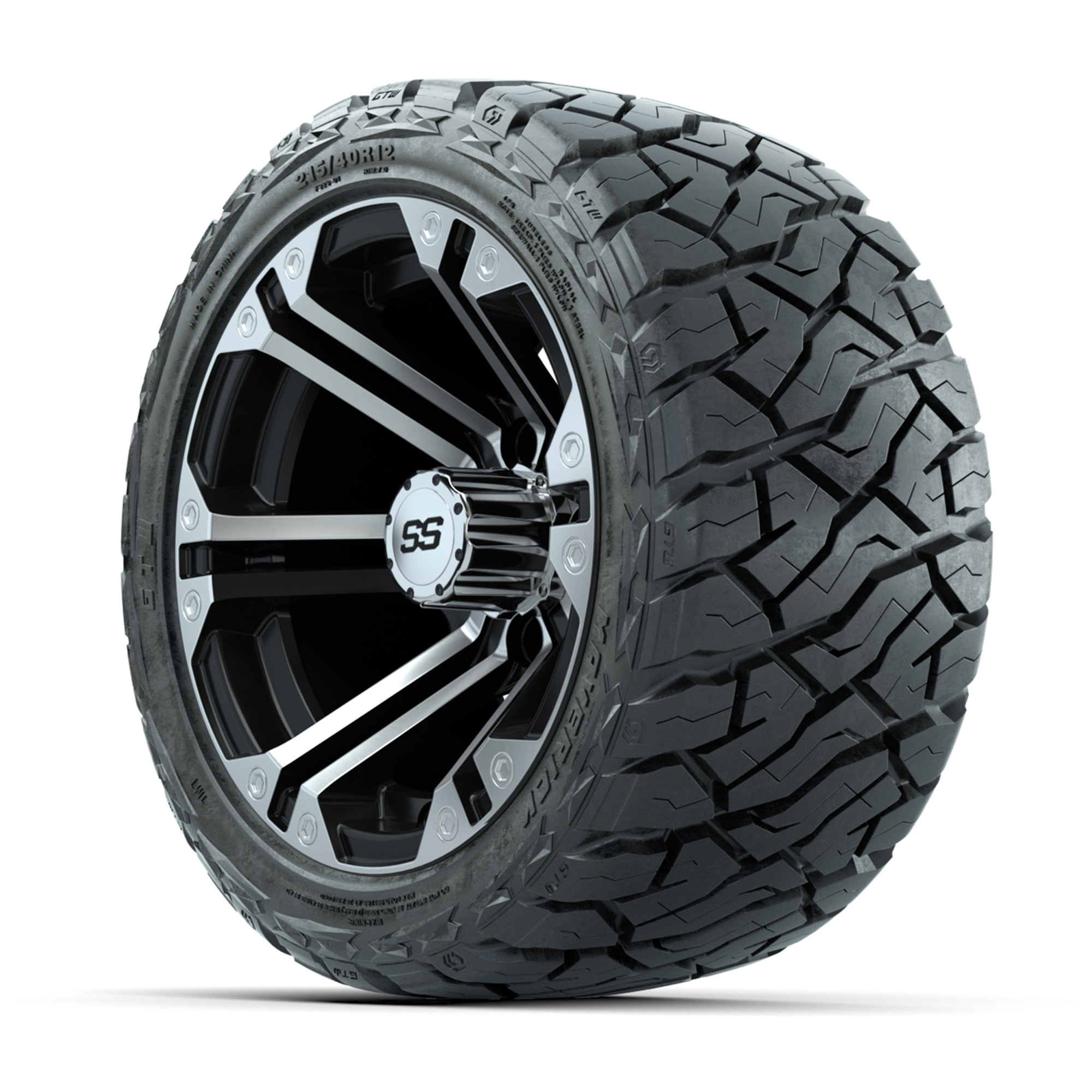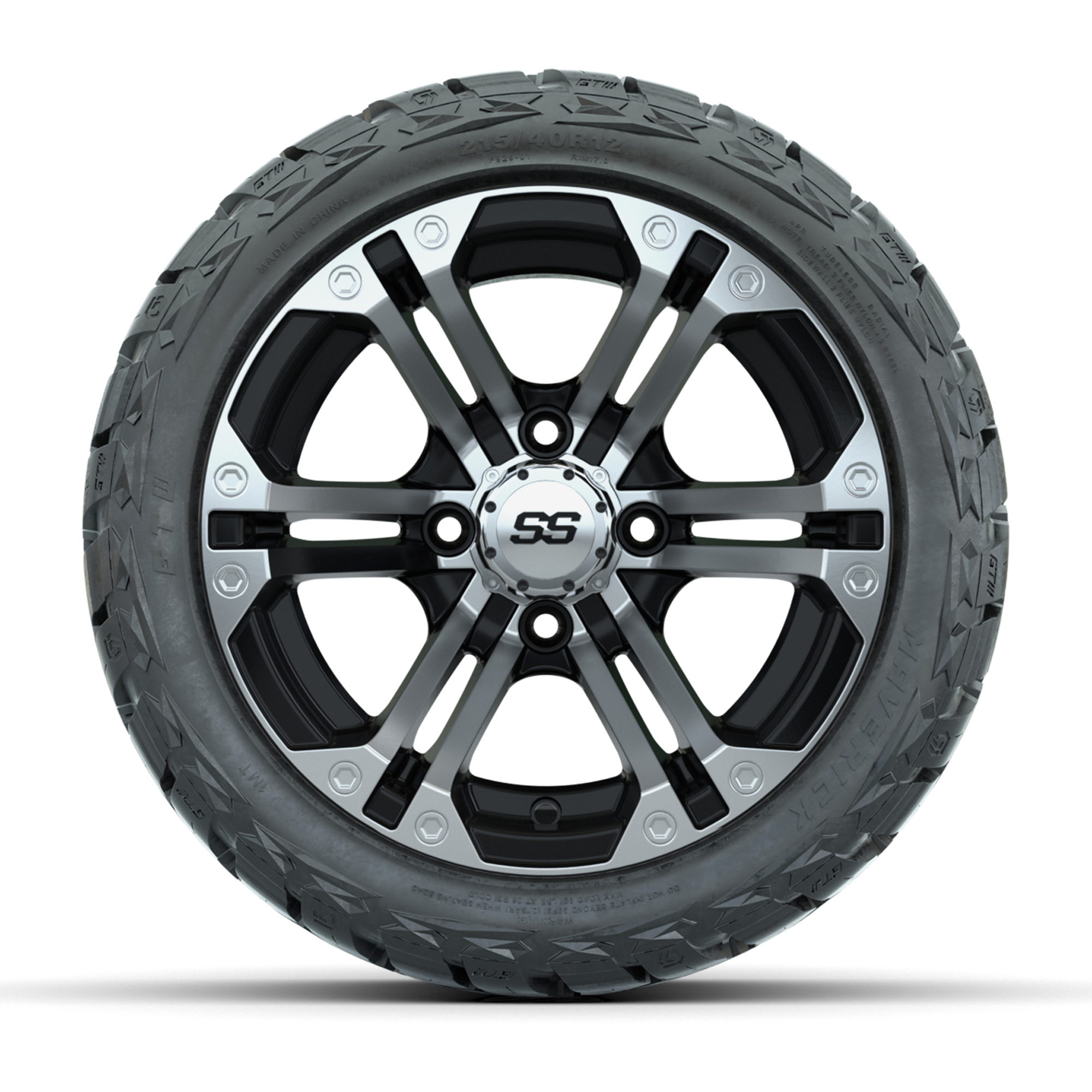 A set of (4) 12-inch GTW® Specter Machined/Black golf cart wheels Mounted on 215/40-R12 Maverick Low-Profile All-Terrain Tires