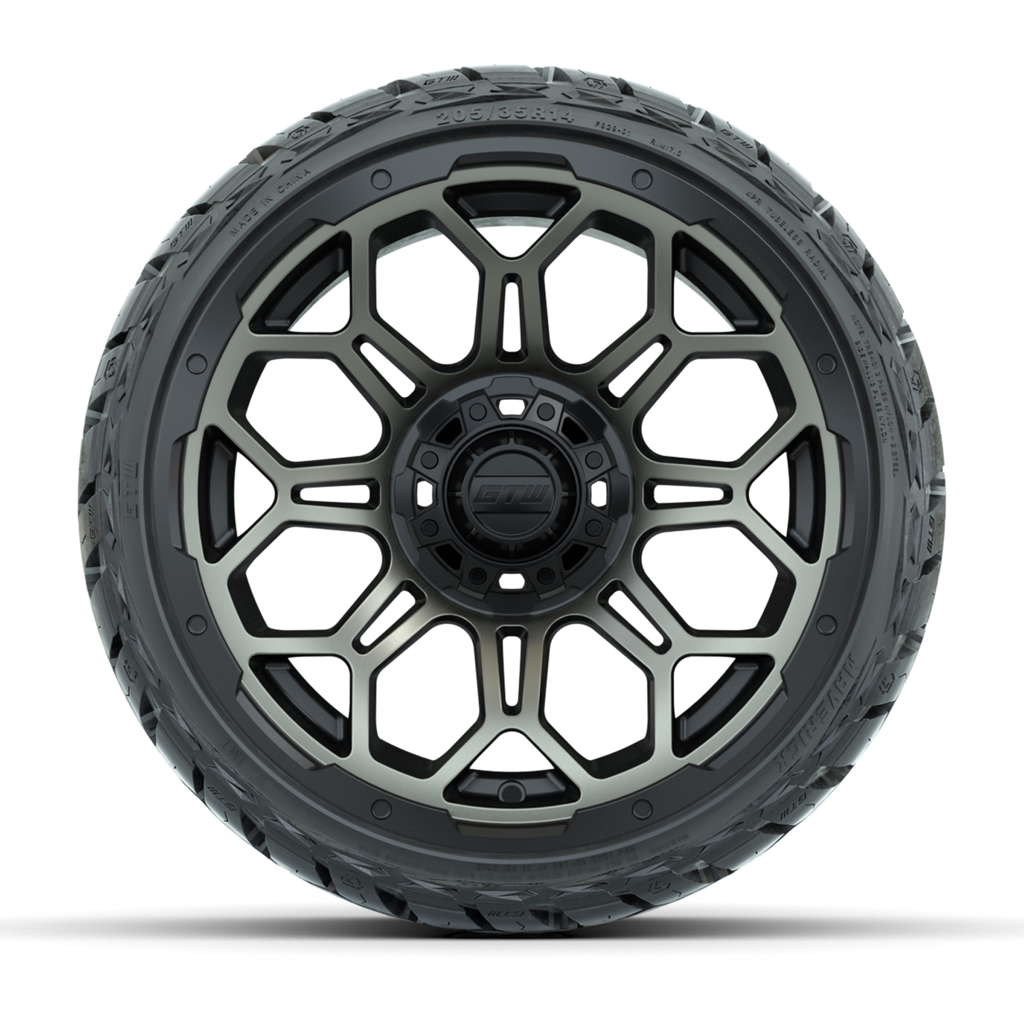 A set of (4) 14-inch GTW® Bravo Matte Bronze golf cart wheels Mounted on 205/35-R14 Maverick Low-Profile All-Terrain Tires