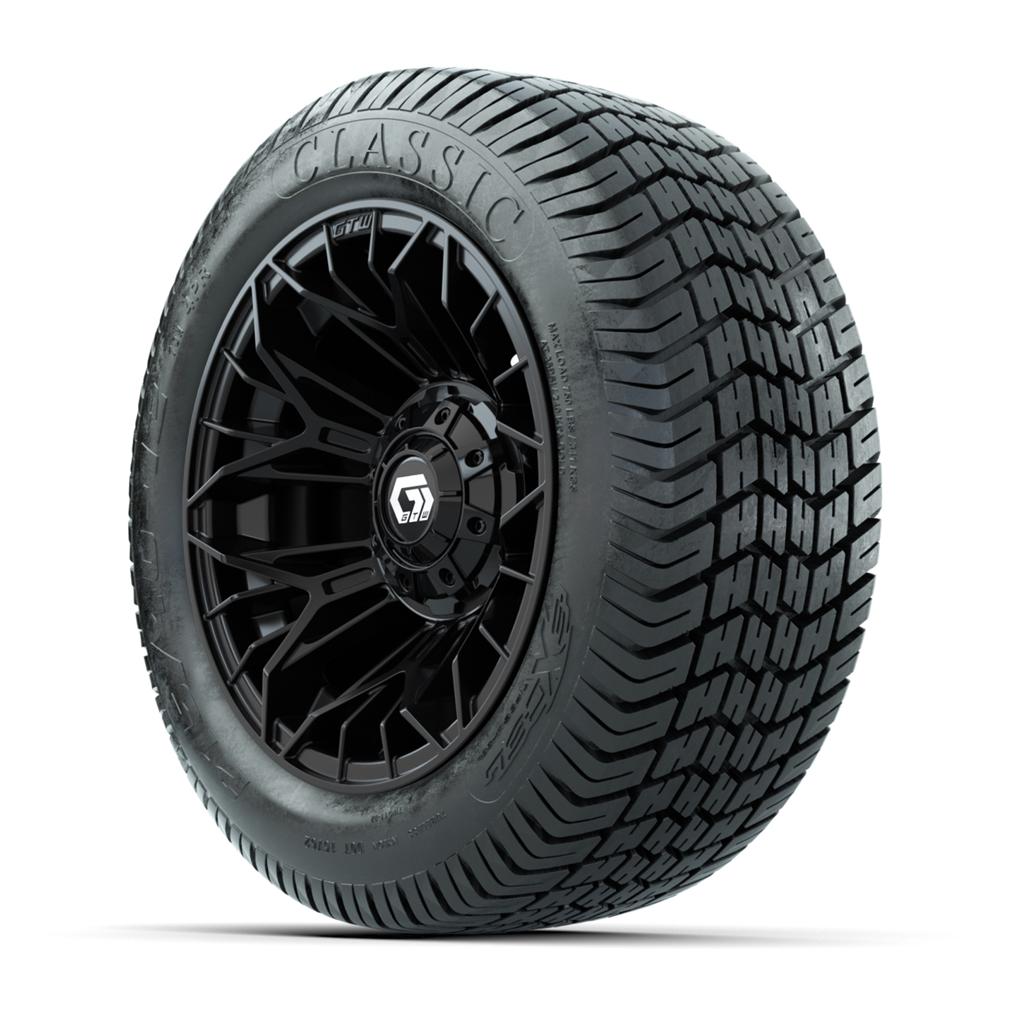 A set of (4) 12-inch GTW® Stellar Black golf cart wheels mounted on 215/40-12 Excel Classic Street Tires