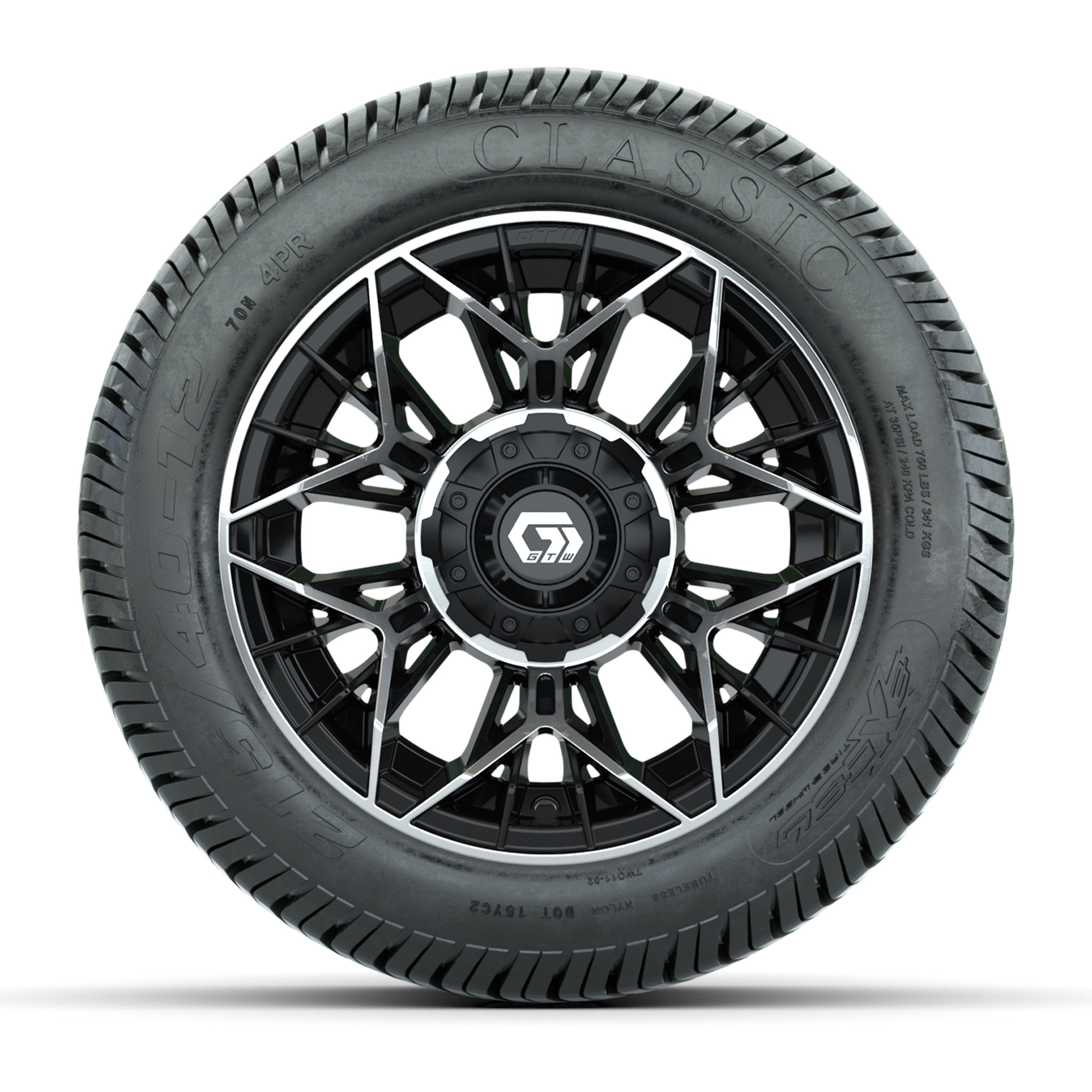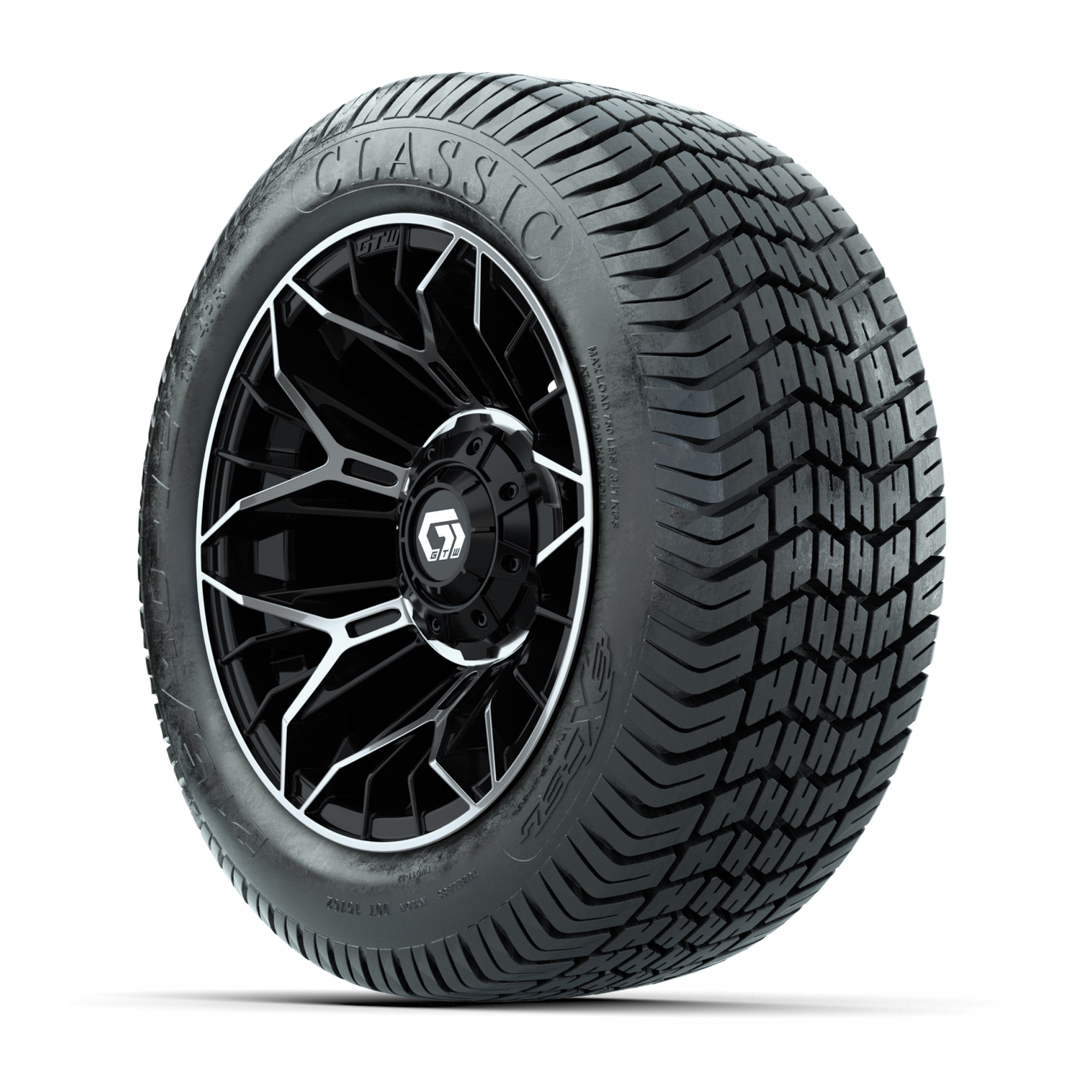 A set of (4) 12-inch GTW® Stellar Black/Machined golf cart wheels mounted on 215/40-12 Excel Classic Street Tires
