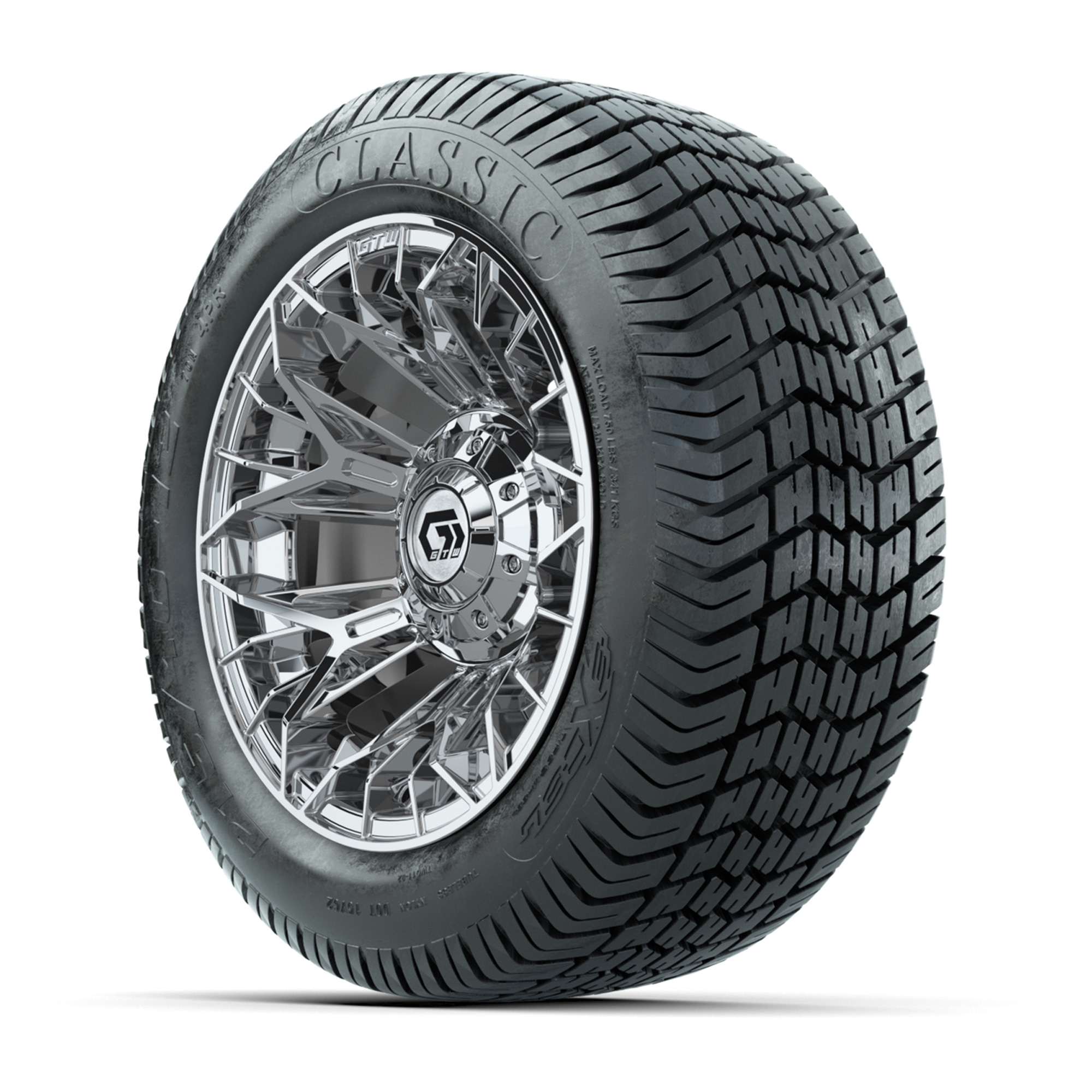 A set of (4) 12-inch GTW® Stellar Chrome golf cart wheels mounted on 215/40-12 Excel Classic Street Tires