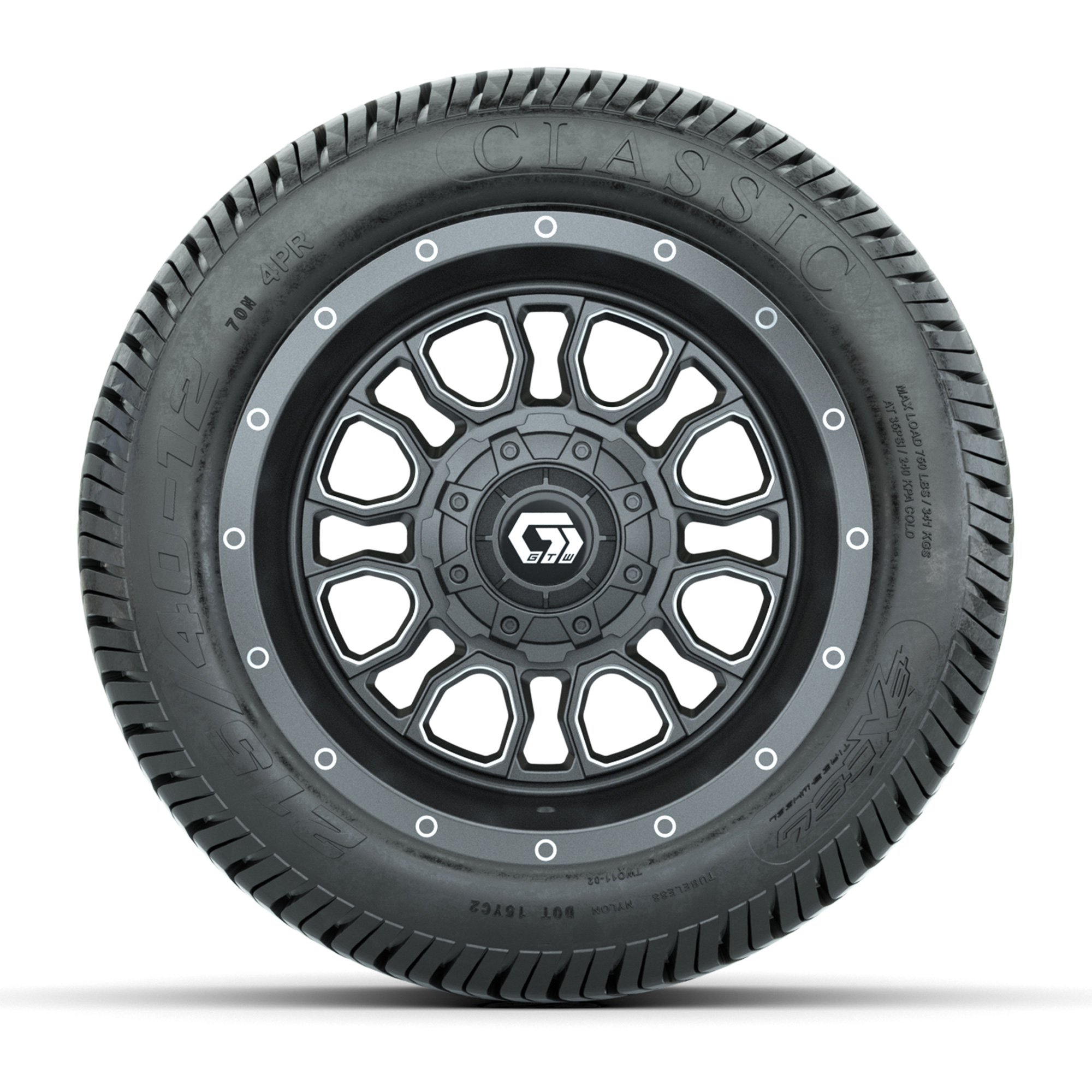 A set of (4) 12-inch GTW® Volt Gunmetal golf cart wheels mounted on 215/40-12 Excel Classic Street Tires