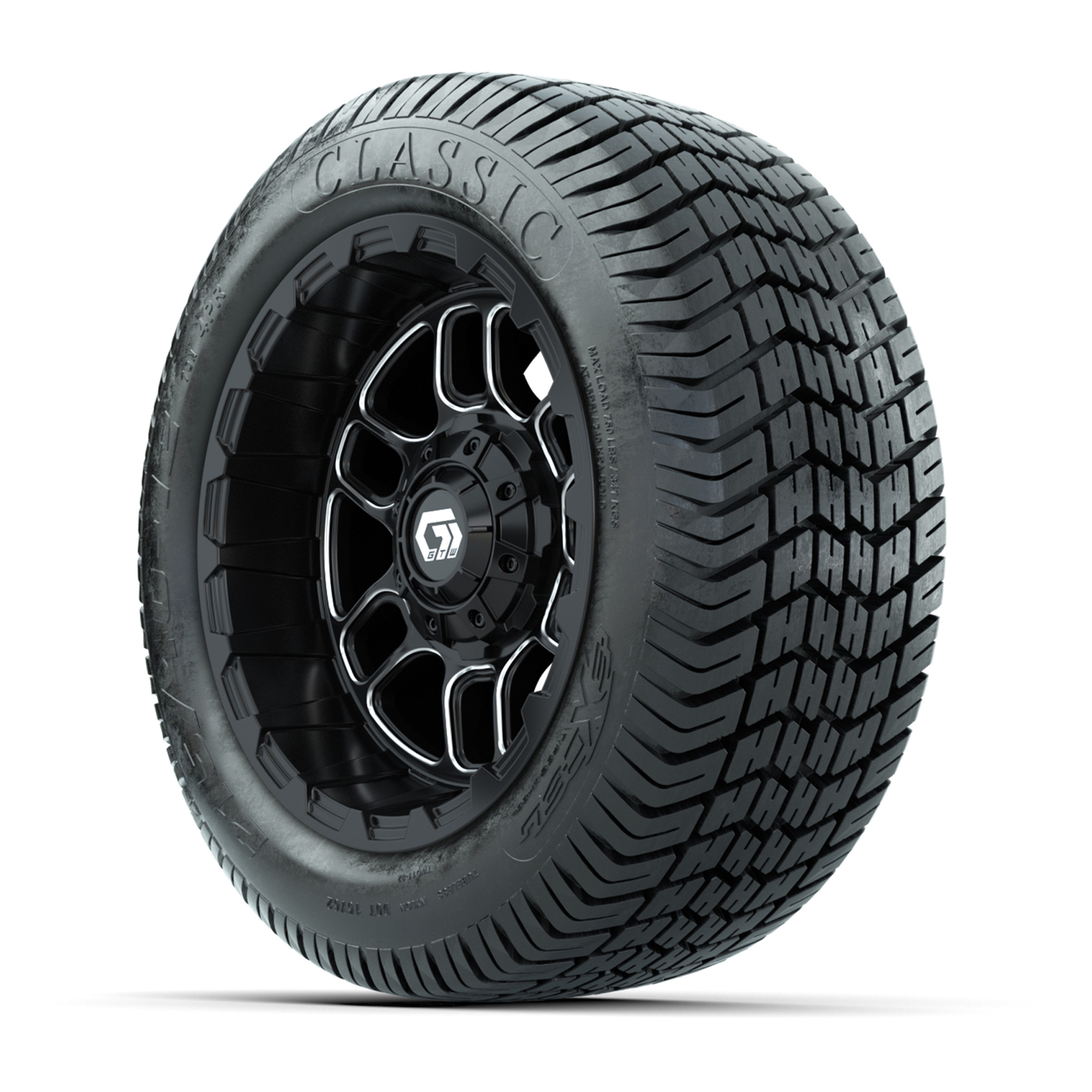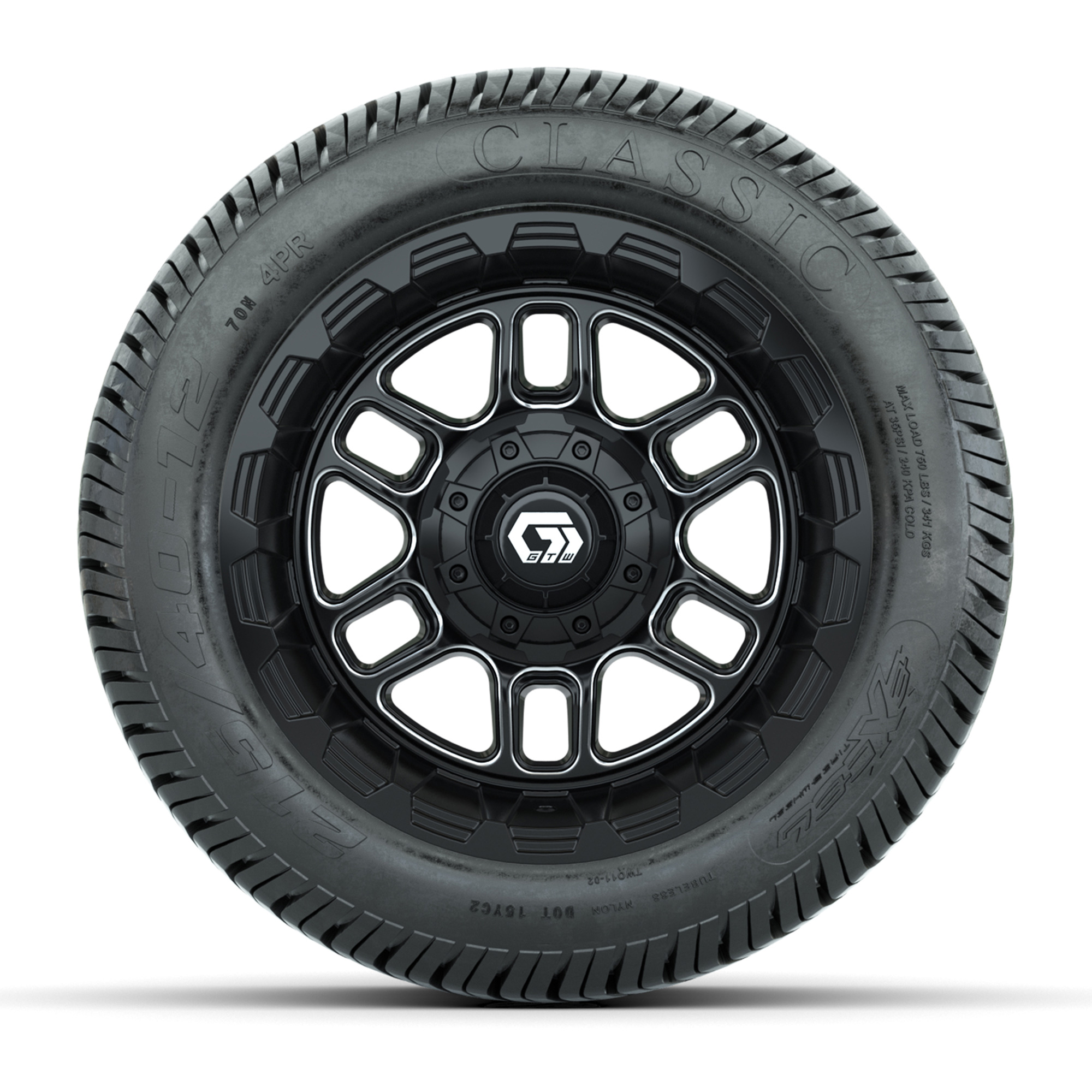A set of (4) 12-inch GTW® Titan Black/Machined golf cart wheels mounted on 215/40-12 Excel Classic Street Tires