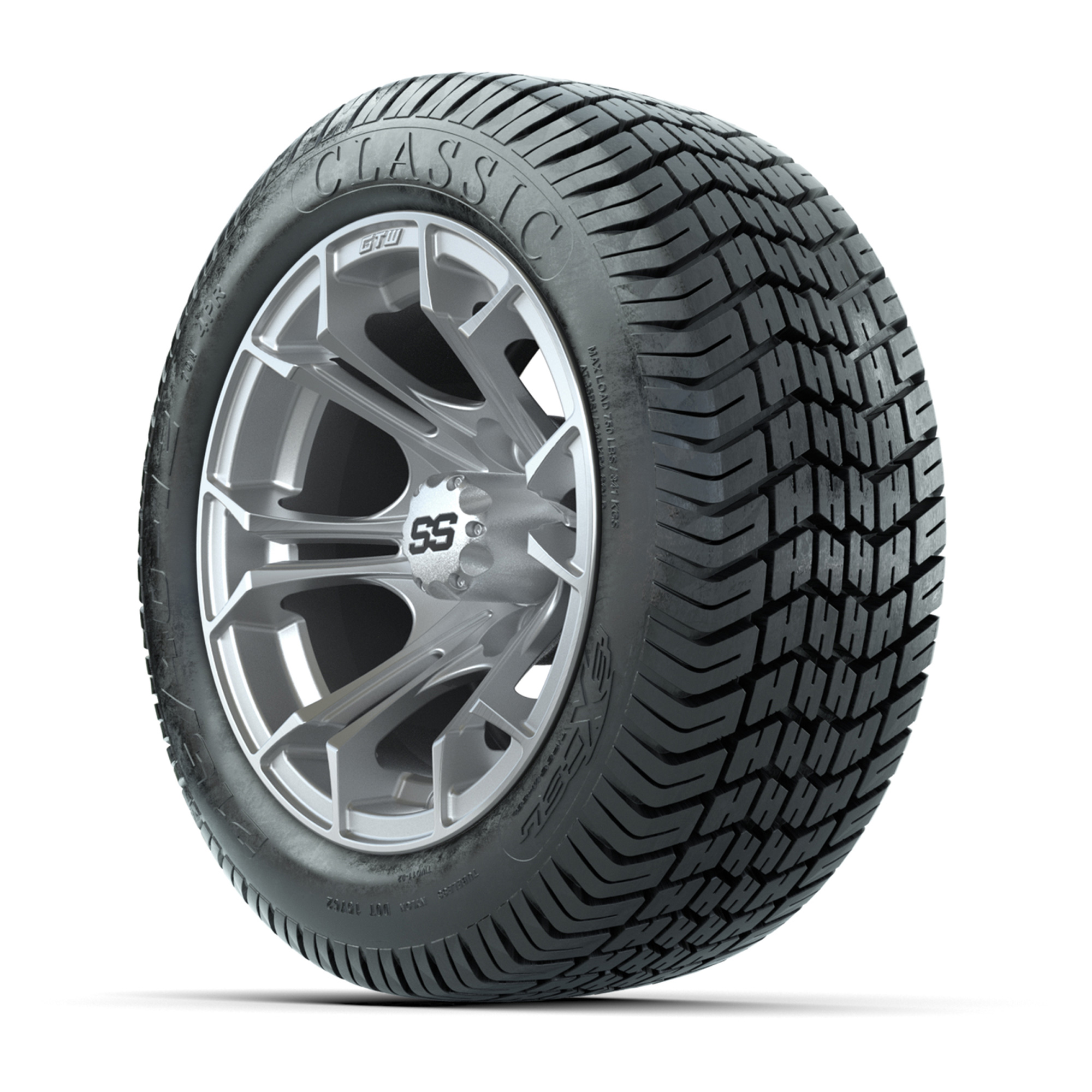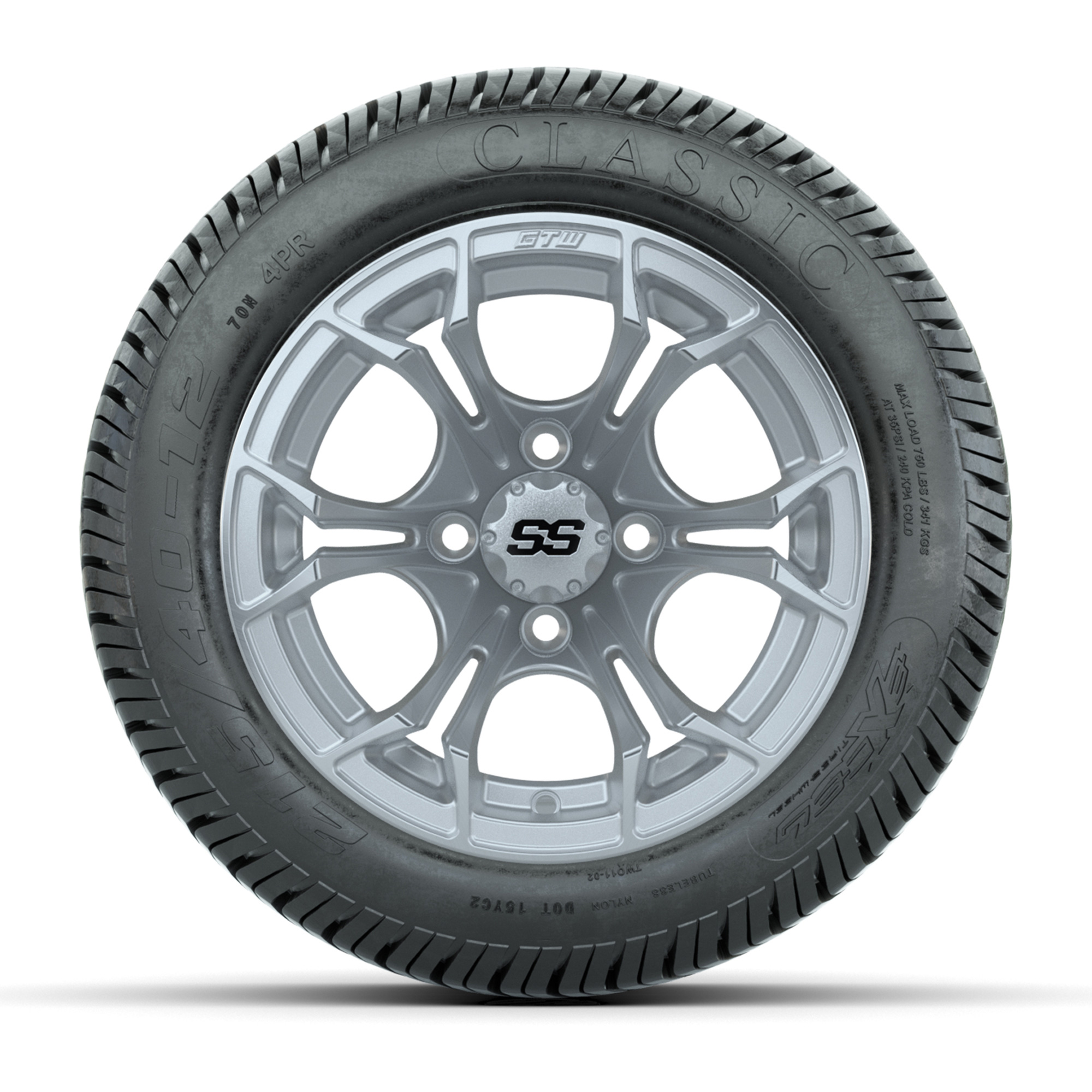 A set of (4) 12-inch GTW® Spyder Silver Brush golf cart wheels mounted on 215/40-12 Excel Classic Street Tires