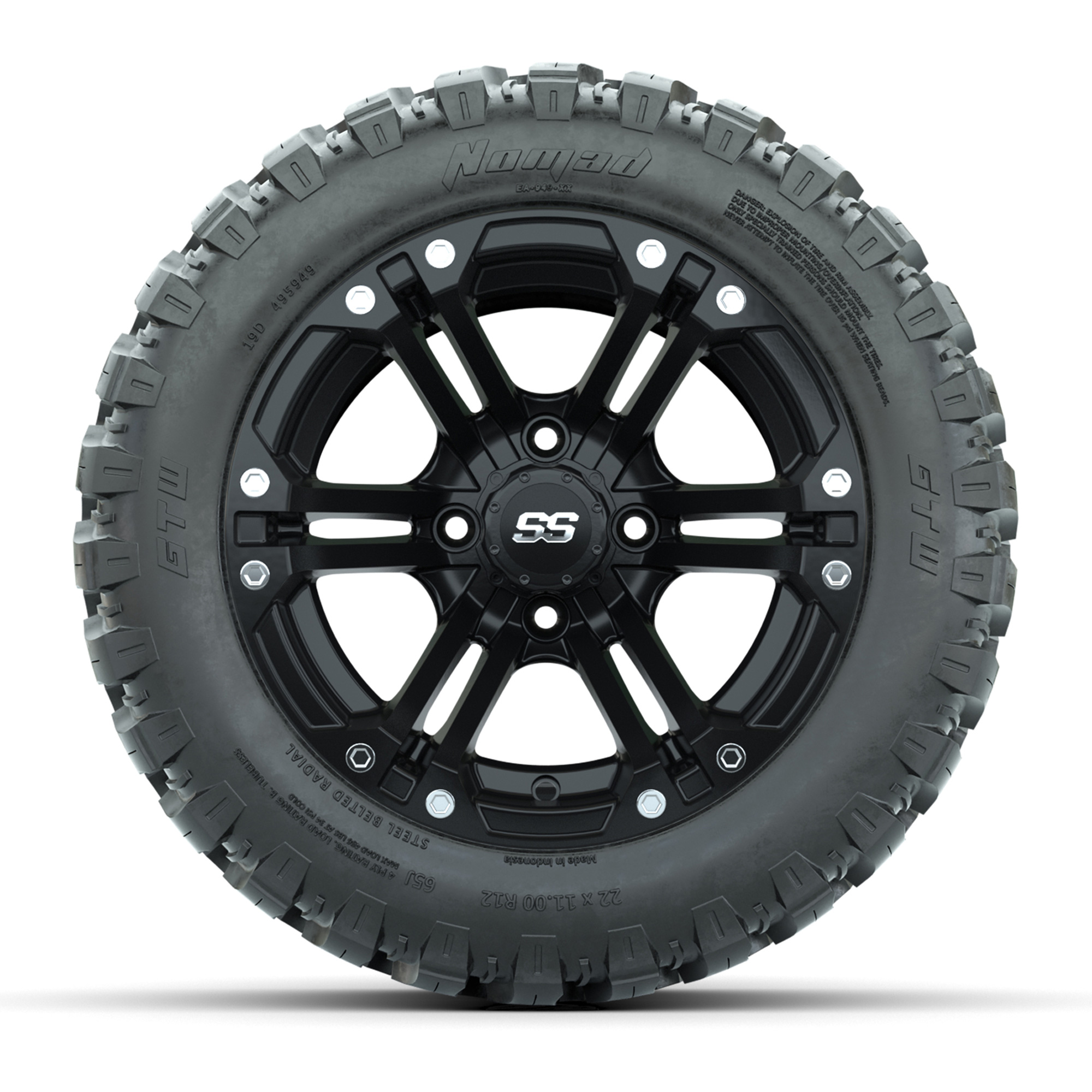 product GTW® Specter Matte Black 12 in Wheels with 22X11-R12 Nomad Steel Belt Radial All-Terrain Tires – Full Set Item # A19-1785 A set of (4) 12-inch GTW® Specter Matte Black golf cart wheels mounted on 22X11-R12 GTW® Nomad Steel Belt Radial All-Terrain TiresTread Classification:All-Terrain / Off-RoadFull Tire & Wheel Package Includes:(4) 12x7 GTW® Specter Wheels / Matte Black finish / Offset: 3:4 (ET -.25)(4) 22X11-R12 Nomad Steel Belt Radial All-Terrain Tires / Tire is approx. 22" tall (4-Ply)(4) Center capsPlease Note: All Wheels are 4 on 4 Hole / Lug Pattern unless otherwise specified.Tech Tips:This Tire & Wheel Combo Requires a Lift Kit (Tire is approx. 22" OD)Please Check and Adjust PSI in Tires Before Operation (Recommended Inflation Can Be Found on Sidewall of Tire)Tire & Wheel Packages are mounted and Inflated Before Shipping, Free of ChargeAll Wheels Have a lug pattern of "4x101.6mm"Lug Nuts Sold SeparatelyStandard Black Lug Nuts #LUG16SBMetric Black Lug Nuts #LUG16MB (Yamaha Models) Find A Dealer
