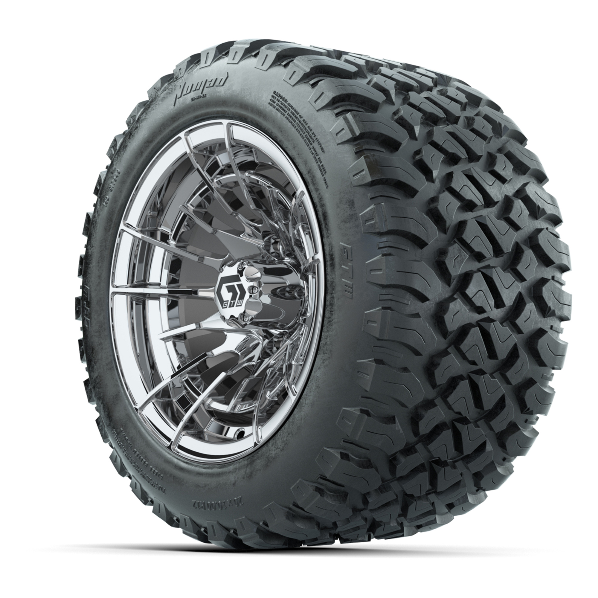 product GTW® Boost Chrome 12 in Wheels with 20X10-12 Nomad Steel Belt Radial All-Terrain Tires – Full Set Item # A19-1817 A set of (4) 12-inch GTW® Boost Chrome golf cart wheels mounted on 20X10-12 GTW® Nomad Steel Belt Radial All-Terrain TiresTread Classification:All-Terrain / Off-RoadFull Tire & Wheel Package Includes:(4) 12x7 GTW® Boost Wheels / Chrome finish / Offset: 3:4 (ET -.25)(4) 20X10-12 Nomad Steel Belt Radial All-Terrain Tires / Tire is approx. 20" tall (4-Ply)(4) Center capsPlease Note: All Wheels are 4 on 4 Hole / Lug Pattern unless otherwise specified.Tech Tips:This Tire & Wheel Combo Requires a Lift Kit (Tire is approx. 20" OD)Please Check and Adjust PSI in Tires Before Operation (Recommended Inflation Can Be Found on Sidewall of Tire)Tire & Wheel Packages are mounted and Inflated Before Shipping, Free of ChargeAll Wheels Have a lug pattern of "4x101.6mm"Lug Nuts Sold SeparatelyStandard Black Lug Nuts #LUG16SBMetric Black Lug Nuts #LUG16MB (Yamaha Models) Find A Dealer