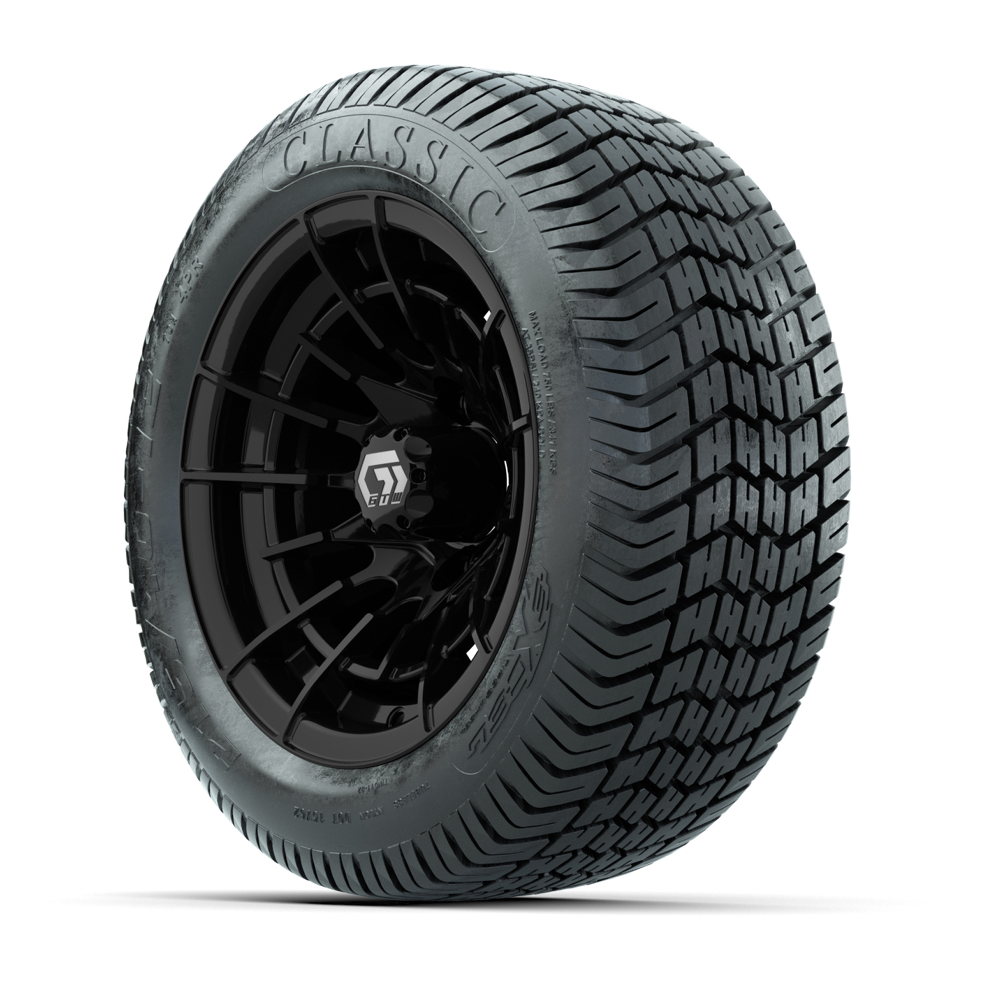 A set of (4) 12-inch GTW® Boost Gloss Black golf cart wheels mounted on 215/40-12 Excel Classic Street Tires