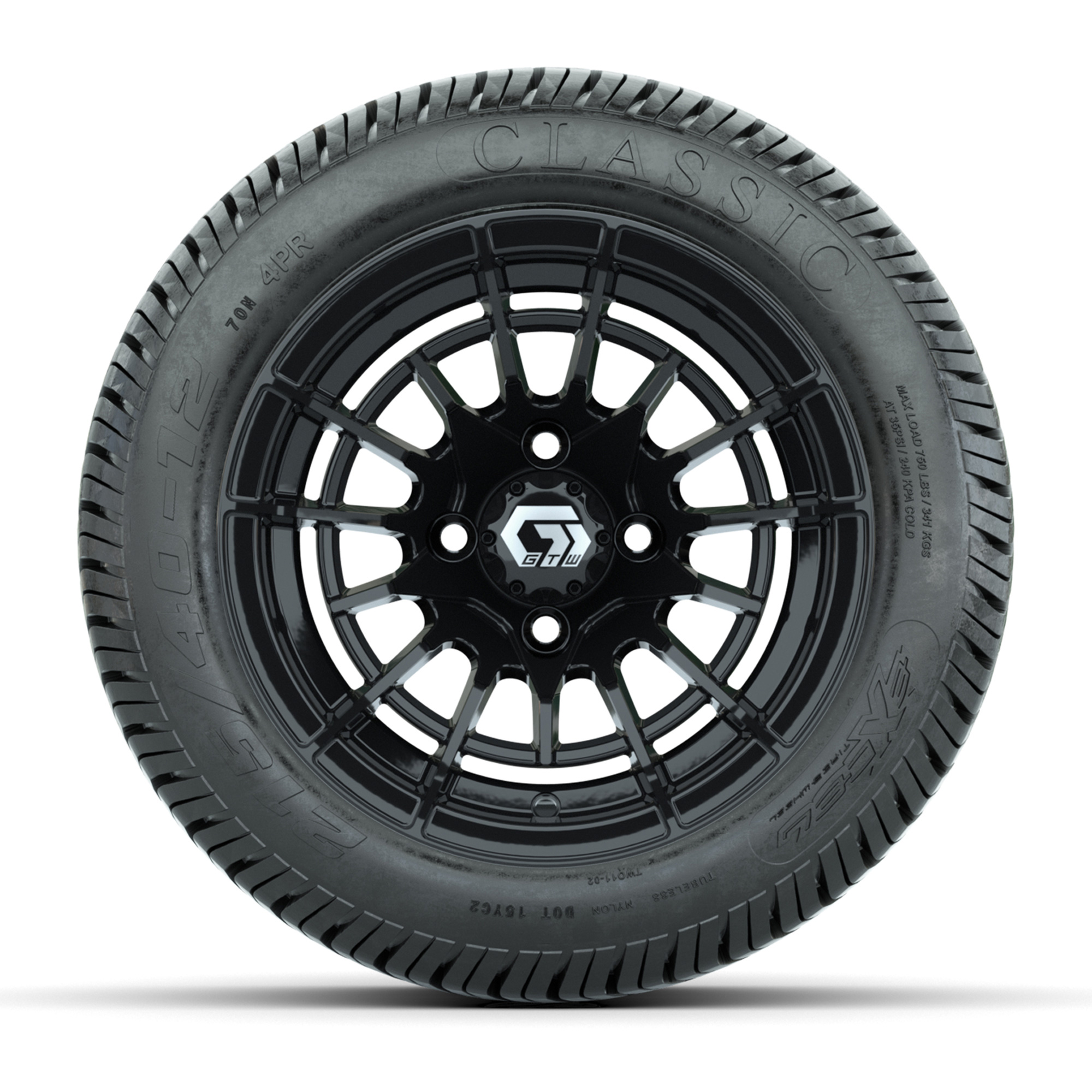 GTW® Boost Gloss Black 12 in Wheels with 215/40-12 Excel Classic Street Tires – Full Set