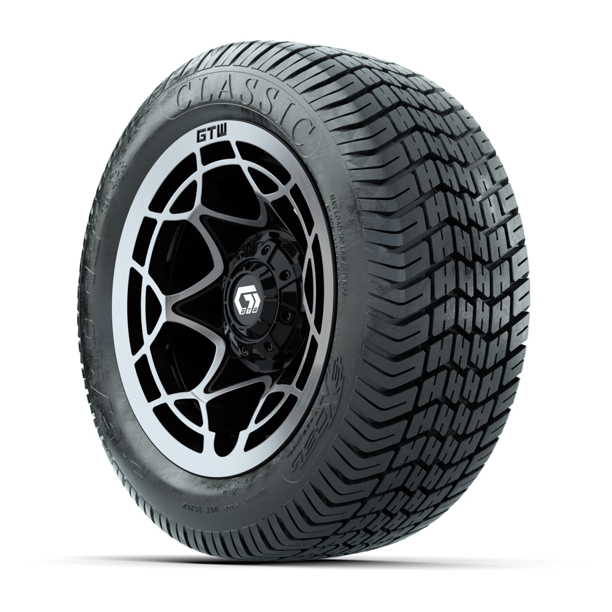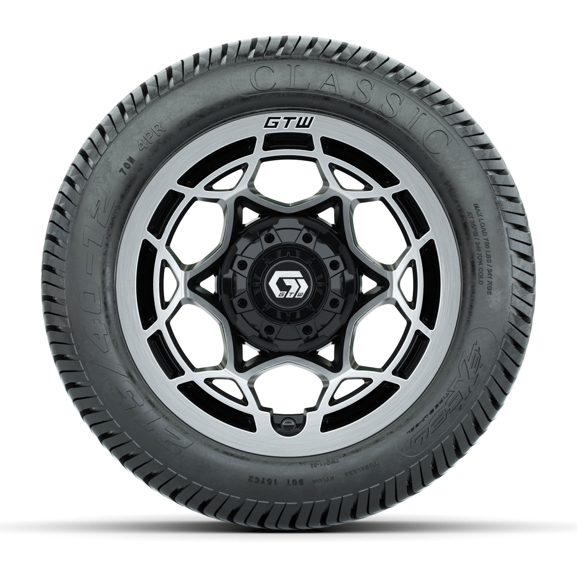 A set of (4) 12-inch GTW® Nexus Black/Silver golf cart wheels mounted on 215/40-12 Excel Classic Street Tires
