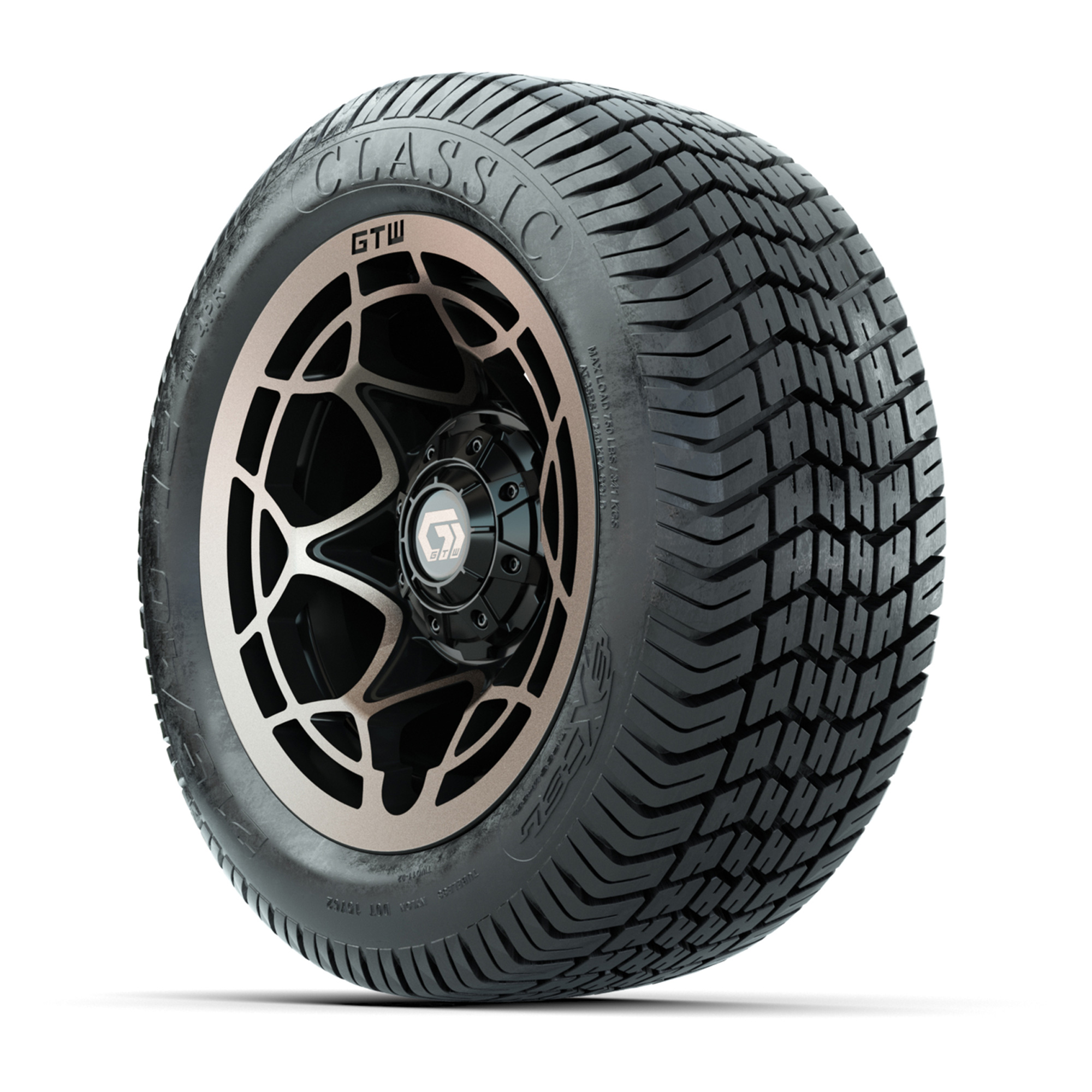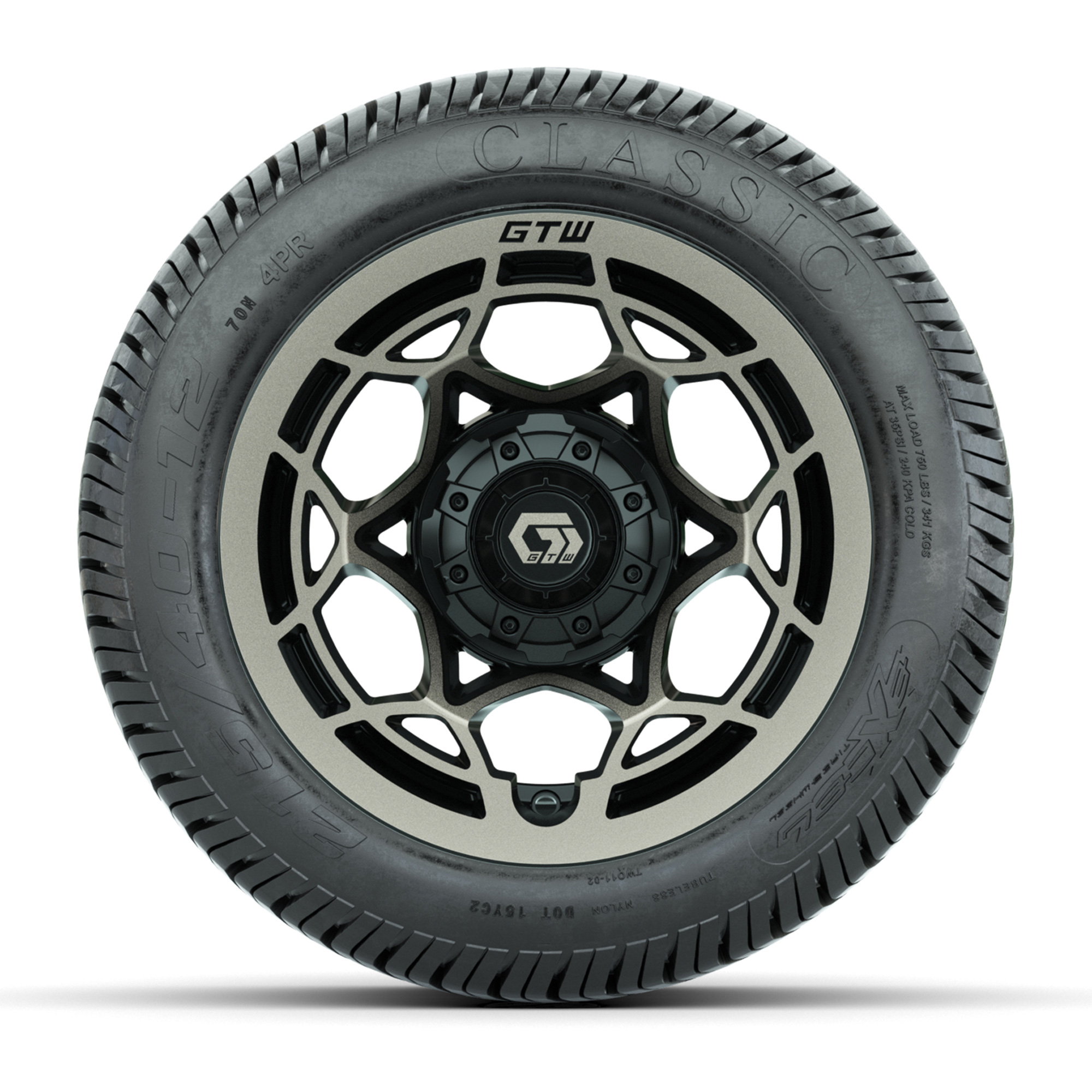 A set of (4) 12-inch GTW® Nexus Black/Bronze golf cart wheels mounted on 215/40-12 Excel Classic Street Tires