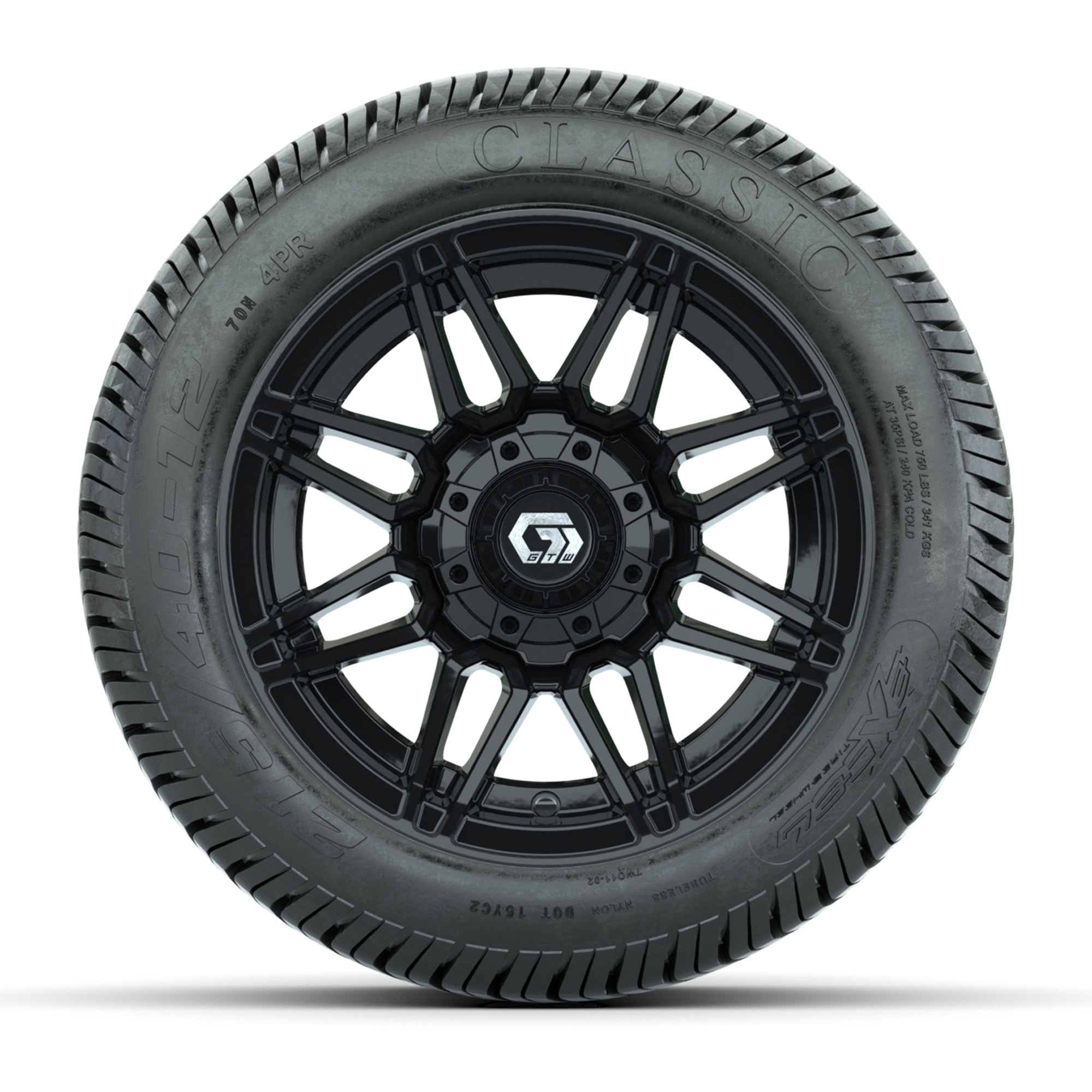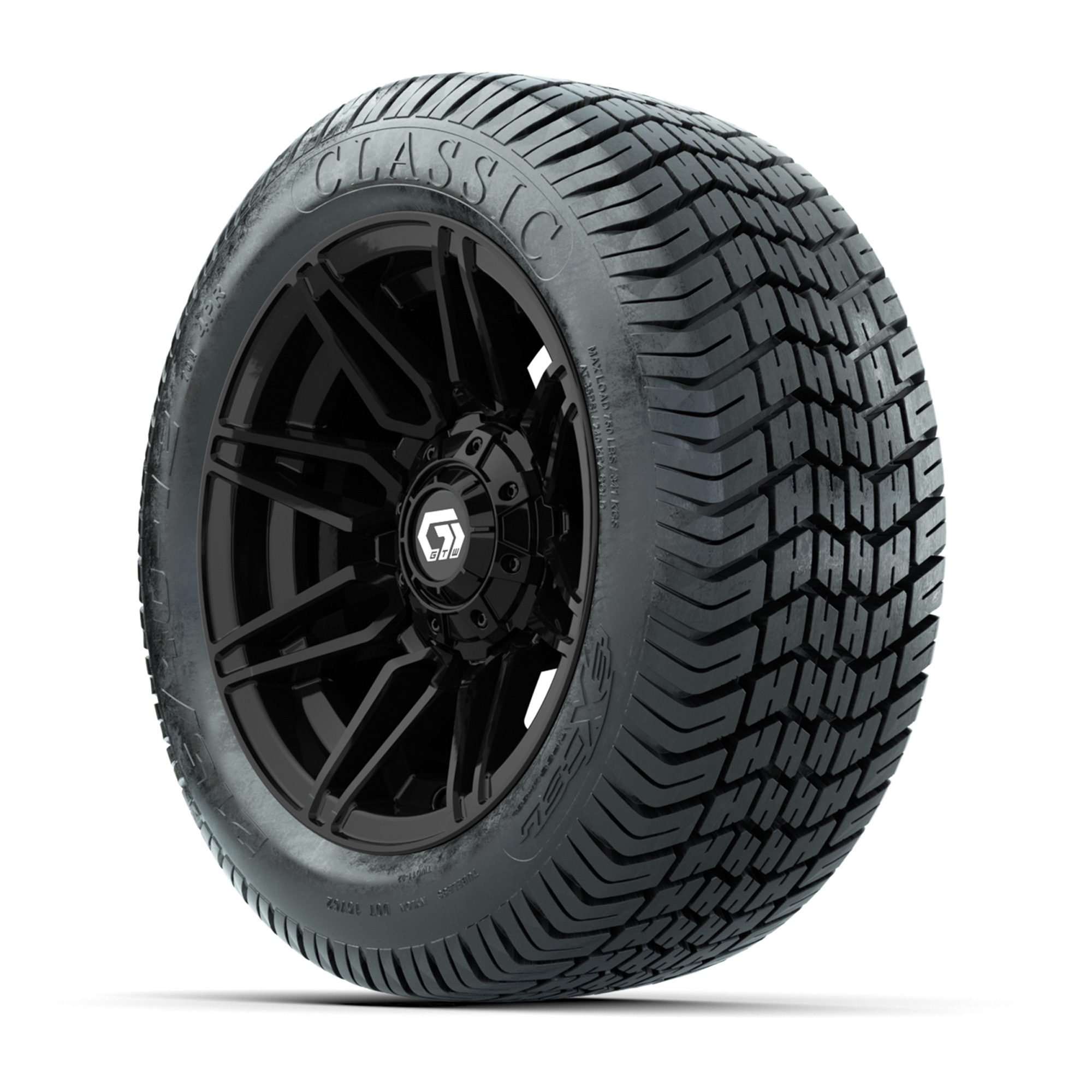 A set of (4) 12-inch GTW® Stealth Gloss Black golf cart wheels mounted on 215/40-12 Excel Classic Street Tires
