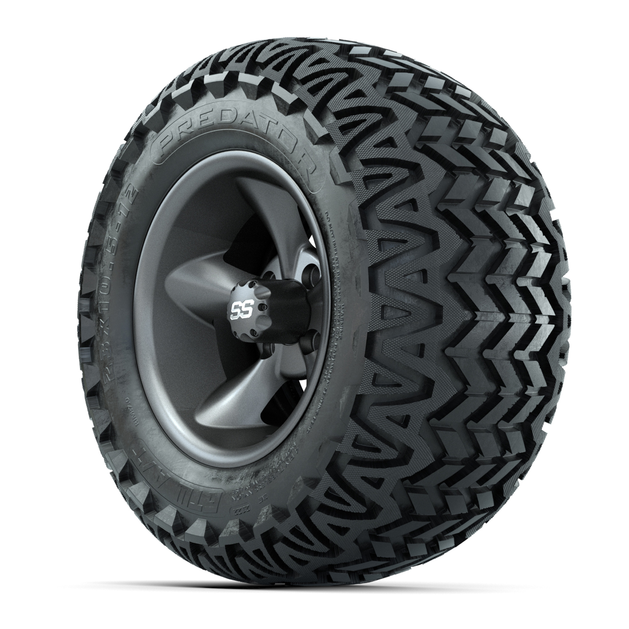 A set of (4) 12-inch GTW® Godfather Matte Gray golf cart wheels mounted on 23x10.5-12 GTW® Predator all-terrain tires