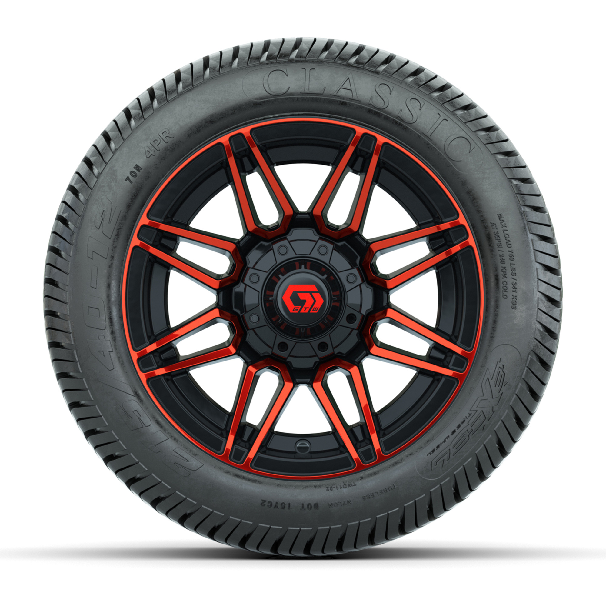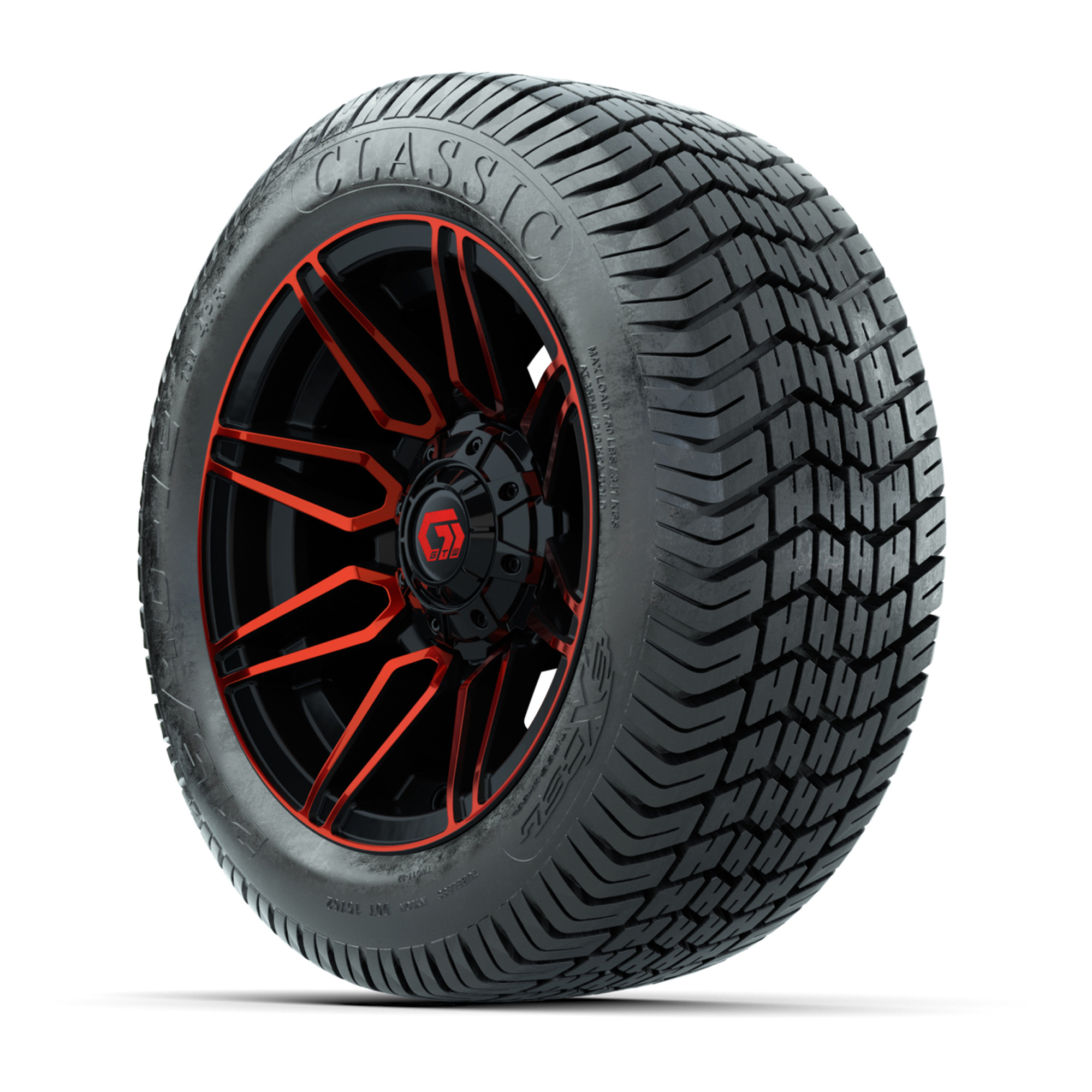 A set of (4) 12-inch GTW® Stealth Red/Machined golf cart wheels mounted on 215/40-12 Excel Classic Street Tires