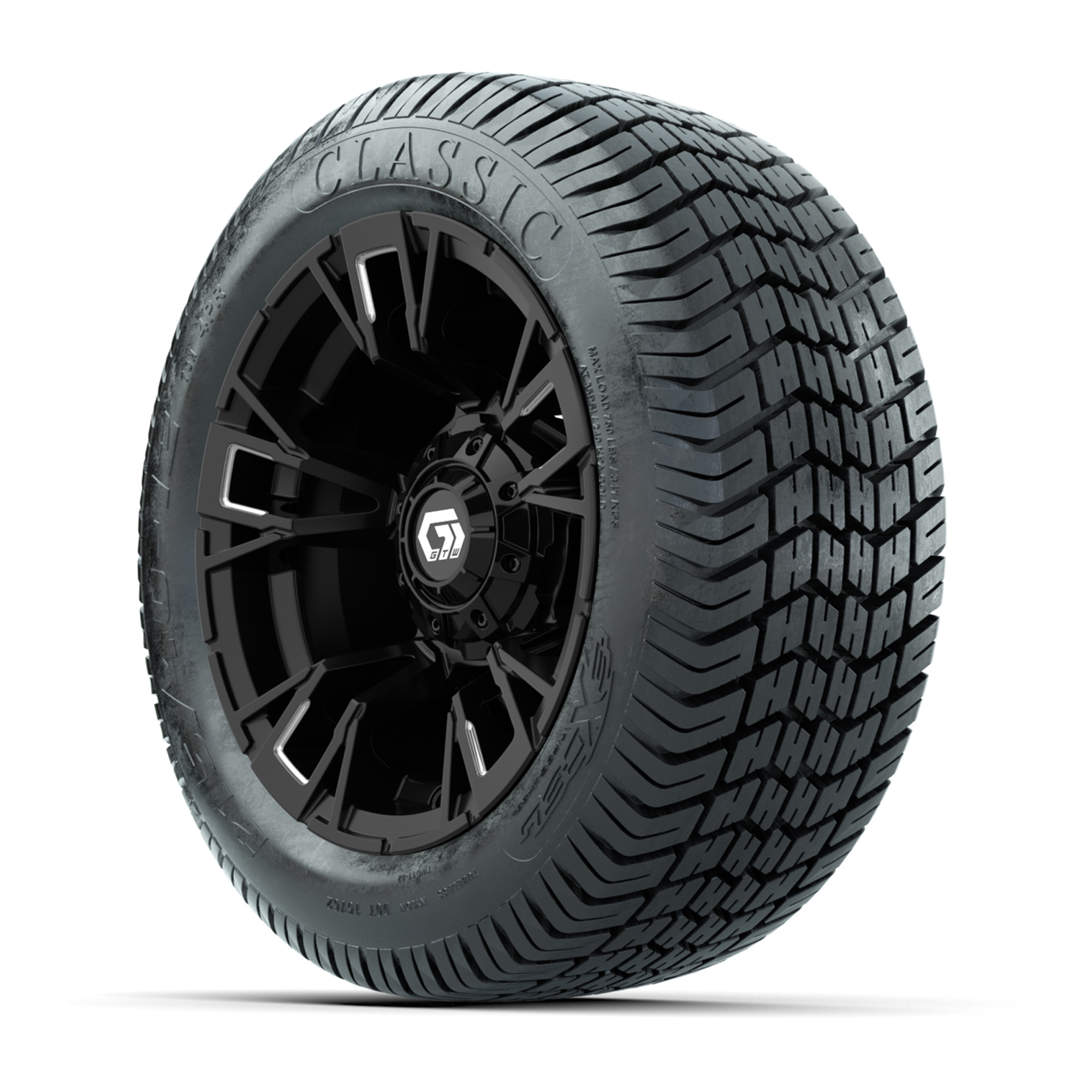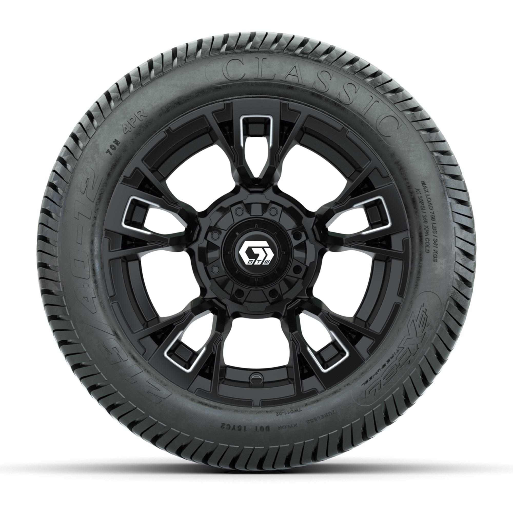 A set of (4) 12-inch GTW® Vandal Matte Black/Machined golf cart wheels mounted on 215/40-12 Excel Classic Street Tires