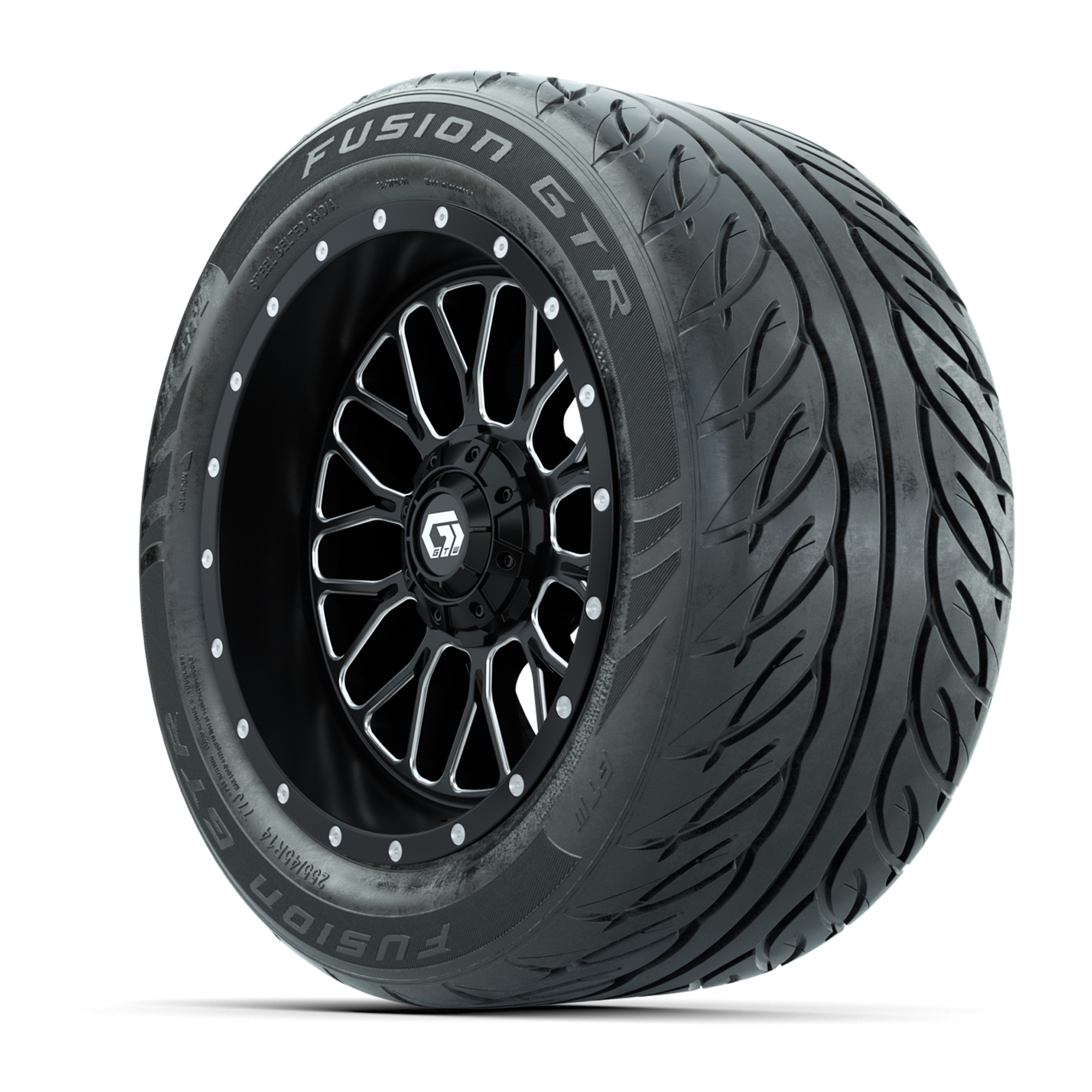 product GTW® Helix Black/Machined 14 in Wheels with 255/45-R14 Fusion GTR Steel Belt Radial Street Tires – Full Set Item # A19-2257 A set of (4) 14-inch GTW® Helix Black/Machined golf cart wheels mounted on 255/45-R14 Fusion GTR Steel Belt Radial Street TiresTread Classification:Street/CourseFull kit includes:(4) 14” GTW® Helix Wheels / Black/Machined Finish / Offset: 3:4 (ET -.25)(4) 255/45-R14 GTW® Fusion GTR Steel Belt Radial Street Tires / Tire is approx. 23” tall (4-Ply)(4) Color match capsLug nuts sold separatelyPlease Note: All Wheels are 4 on 4 Hole / Lug Pattern (4x101.6mm) unless otherwise specified.Tech Tips:We Recommend a Lift Kit for This Tire & Wheel KitTire & Wheel Combos are mounted and Inflated Before Shipping, Free of Charge Please Check and Adjust PSI in Tires Before Operation (Recommended Inflation Can Be Found on Sidewall of Tire)All Wheels Have a lug pattern of "4x101.6mm"Lug Nuts Sold Separately: Standard: #LUG4S (Standard Chrome Lug Nuts) Metric: #LUG4M (Yamaha Models) Find A Dealer