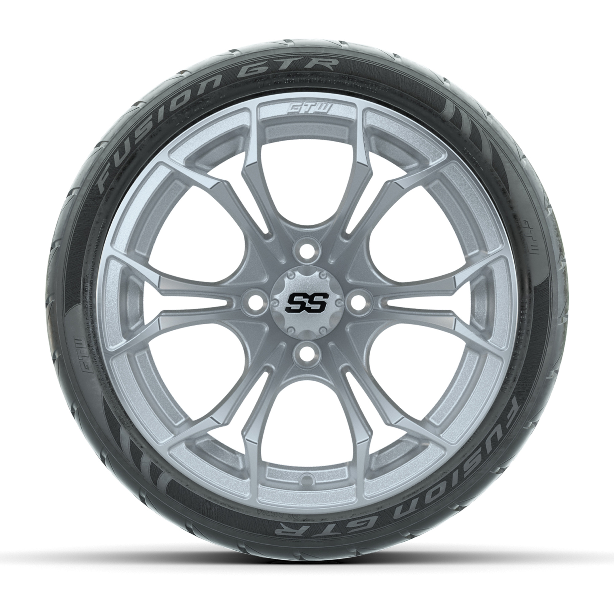 A set of (4) 14-inch GTW® Spyder Silver Brush golf cart wheels mounted on 205/40-R14 Fusion GTR Steel Belt Radial Street Tires