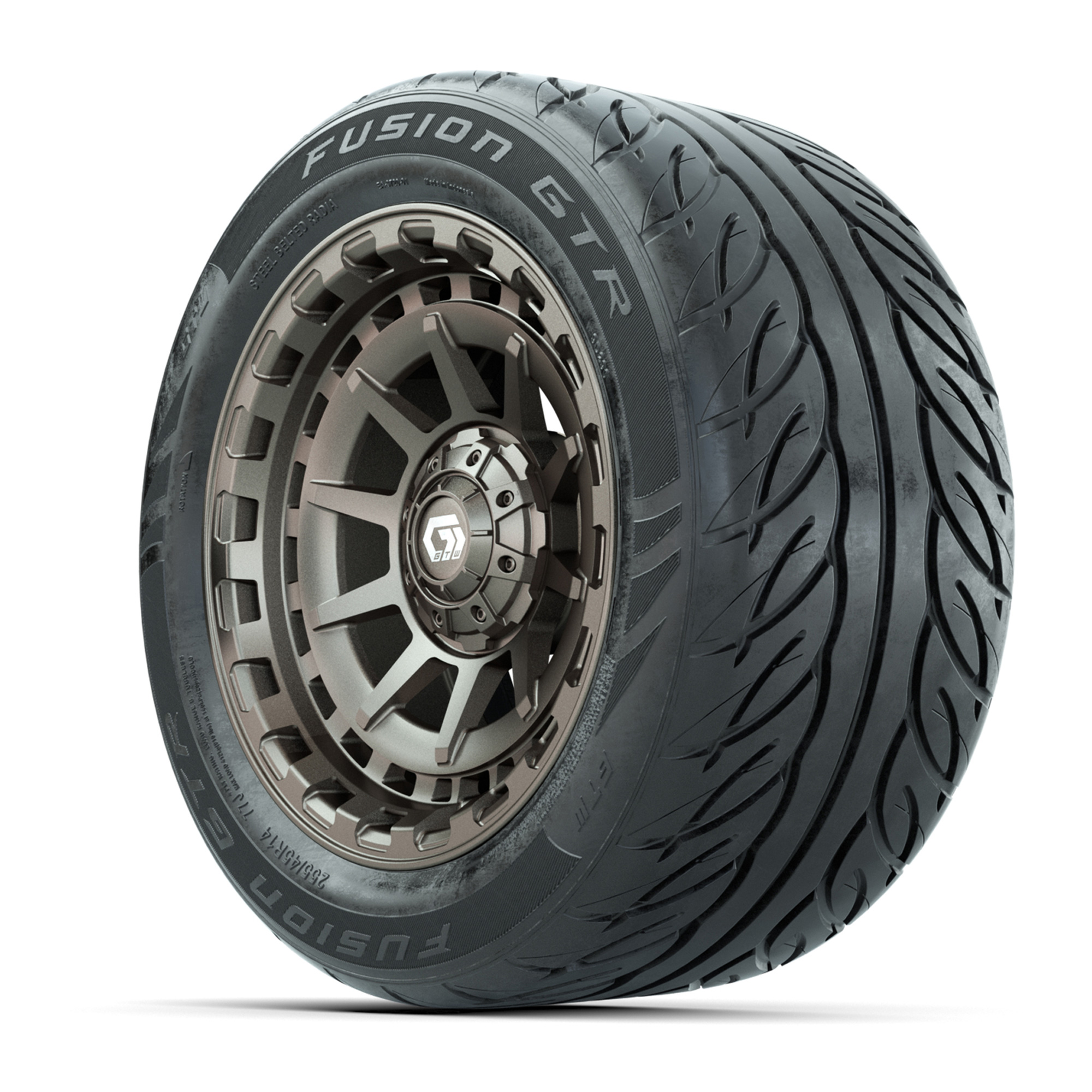 product GTW® Barricade Bronze 14 in Wheels with 255/45-R14 Fusion GTR Steel Belt Radial Street Tires – Full Set Item # A19-2343 A set of (4) 14-inch GTW® Barricade Bronze golf cart wheels mounted on 255/45-R14 Fusion GTR Steel Belt Radial Street TiresTread Classification:Street/CourseFull kit includes:(4) 14” GTW® Barricade Wheels / Bronze Finish / Offset: 3:4 (ET -.25)(4) 255/45-R14 GTW® Fusion GTR Steel Belt Radial Street Tires / Tire is approx. 23” tall (4-Ply)(4) Color match capsLug nuts sold separatelyPlease Note: All Wheels are 4 on 4 Hole / Lug Pattern (4x101.6mm) unless otherwise specified.Tech Tips:We Recommend a Lift Kit for This Tire & Wheel KitTire & Wheel Combos are mounted and Inflated Before Shipping, Free of Charge Please Check and Adjust PSI in Tires Before Operation (Recommended Inflation Can Be Found on Sidewall of Tire)All Wheels Have a lug pattern of "4x101.6mm"Lug Nuts Sold Separately: Standard: #LUG4S (Standard Chrome Lug Nuts) Metric: #LUG4M (Yamaha Models) Find A Dealer