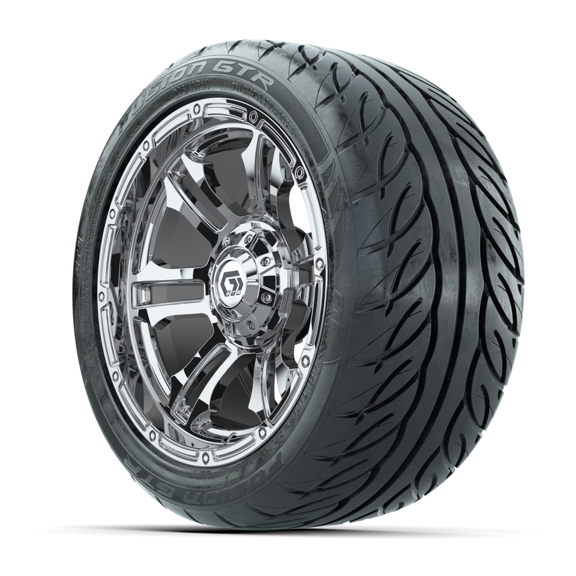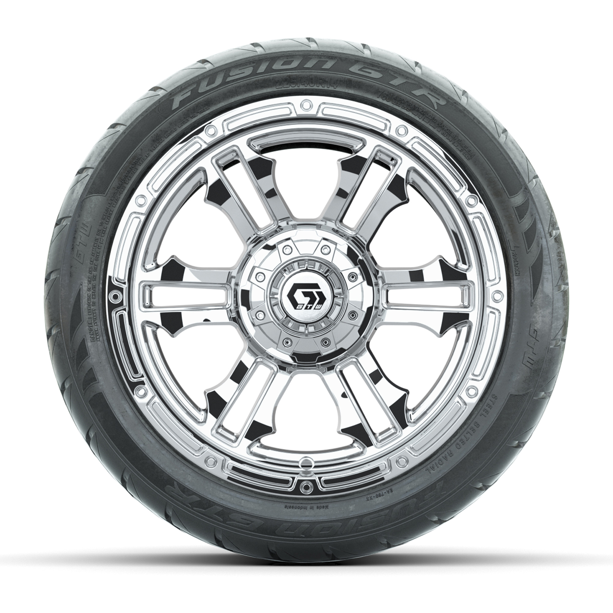 A set of (4) 14-inch GTW® Shogun Chrome golf cart wheels mounted on 225/40-R14 Fusion GTR Steel Belt Radial Street Tires
