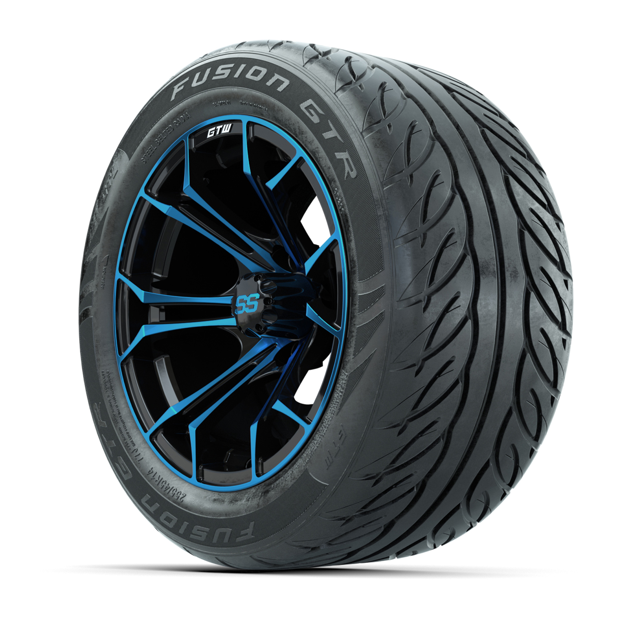 product GTW® Spyder Black/Blue 14 in Wheels with 255/45-R14 Fusion GTR Steel Belt Radial Street Tires – Full Set Item # A19-2409 A set of (4) 14-inch GTW® Spyder Black/Blue golf cart wheels mounted on 255/45-R14 Fusion GTR Steel Belt Radial Street TiresTread Classification:Street/CourseFull kit includes:(4) 14” GTW® Spyder Wheels / Black/Blue Finish / Offset: 3:4 (ET -.25)(4) 255/45-R14 GTW® Fusion GTR Steel Belt Radial Street Tires / Tire is approx. 23” tall (4-Ply)(4) Color match capsLug nuts sold separatelyPlease Note: All Wheels are 4 on 4 Hole / Lug Pattern (4x101.6mm) unless otherwise specified.Tech Tips:We Recommend a Lift Kit for This Tire & Wheel KitTire & Wheel Combos are mounted and Inflated Before Shipping, Free of Charge Please Check and Adjust PSI in Tires Before Operation (Recommended Inflation Can Be Found on Sidewall of Tire)All Wheels Have a lug pattern of "4x101.6mm"Lug Nuts Sold Separately: Standard: #LUG4S (Standard Chrome Lug Nuts) Metric: #LUG4M (Yamaha Models) Find A Dealer