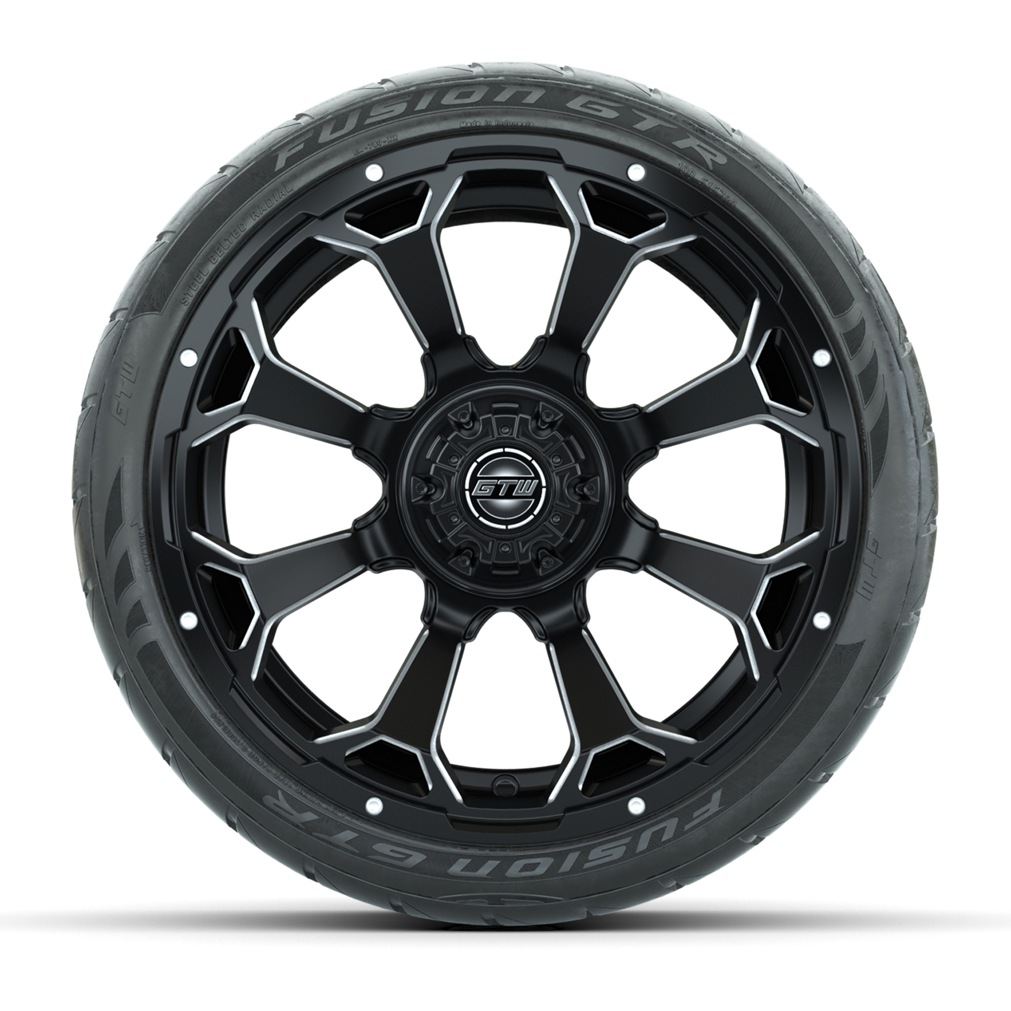 product GTW Raven Matte Black/Ball Mill 15 in Wheels with 215/40-R15 Fusion GTR Steel Belt Radial Street Tires – Full Set Item # A19-2613 A set of (4) 15-inch GTW® Raven Matte Black/Ball Milled golf cart wheels mounted on 215/40-R15 Fusion GTR Steel Belt Radial Street TiresTread Classification:Street/CourseFull kit includes:(4) 15” GTW® Raven Wheels / Matte Black/Ball Mill Finish / Offset: 3:4 (ET -.25)(4) 215/40-R15 GTW Fusion GTR Steel Belted Radial Street Tires / Tire is approx. 22” tall (4-Ply)(4) Color match capsLug nuts sold separatelyPlease Note: All Wheels are 4 on 4 Hole / Lug Pattern (4x101.6mm) unless otherwise specified.Tech Tips:We Recommend a Lift Kit for This Tire & Wheel KitTire & Wheel Combos are mounted and Inflated Before Shipping, Free of Charge Please Check and Adjust PSI in Tires Before Operation (Recommended Inflation Can Be Found on Sidewall of Tire)All Wheels Have a lug pattern of "4x101.6mm"Lug Nuts Sold Separately: Standard: #LUG4S (Standard Chrome Lug Nuts) Metric: #LUG4M (Yamaha Models) Find A Dealer