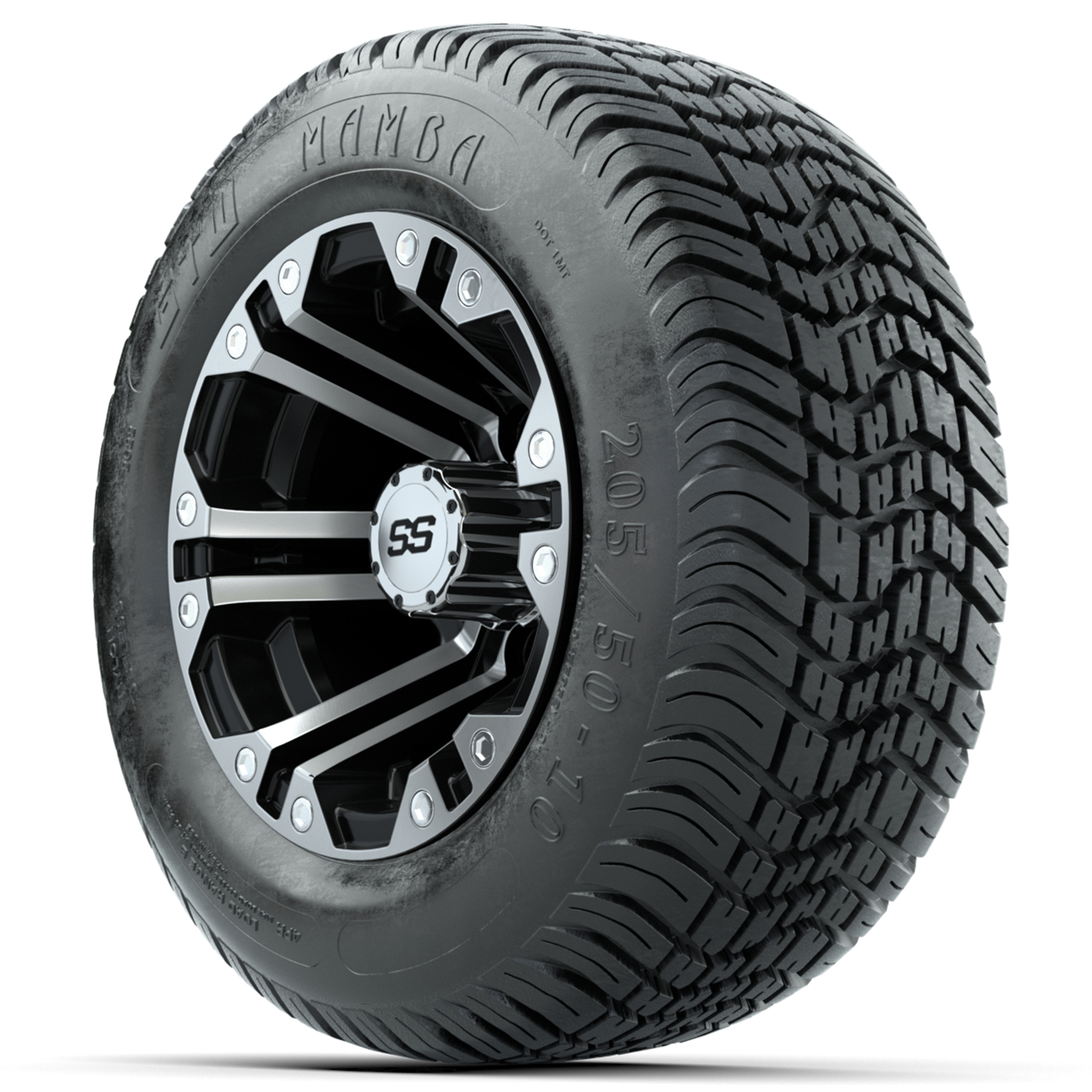product Set of (4) 10 in GTW Specter Wheels with 205/50-10 Mamba Street Tires Item # A19-448 Tread Classification:Street/Turf/CourseFull kit includes:(4) 10x7 GTW Specter Wheels / Machined & Black Finish / Offset: 3:4 (ET -.25)(4) 205/50-10 GTW Mamba Street Tires / Tire is approx. 18” tall (4-Ply)(4) Center CapsPlease Note: All Wheels are 4 on 4 Hole / Lug Pattern unless otherwise specified.Tech Tips:This Tire & Wheel Combo Does Not Require a Lift KitTire & Wheel Combos are mounted and Inflated Before Shipping, Free of Charge Please Check and Adjust PSI in Tires Before Operation (Recommended Inflation Can Be Found on Sidewall of Tire)All Wheels Have a lug pattern of "4x101.6mm"Lug Nuts Sold Separately: Standard: #LUG4S (Standard Chrome Lug Nuts) Metric: #LUG4M (Yamaha Models) Find A Dealer