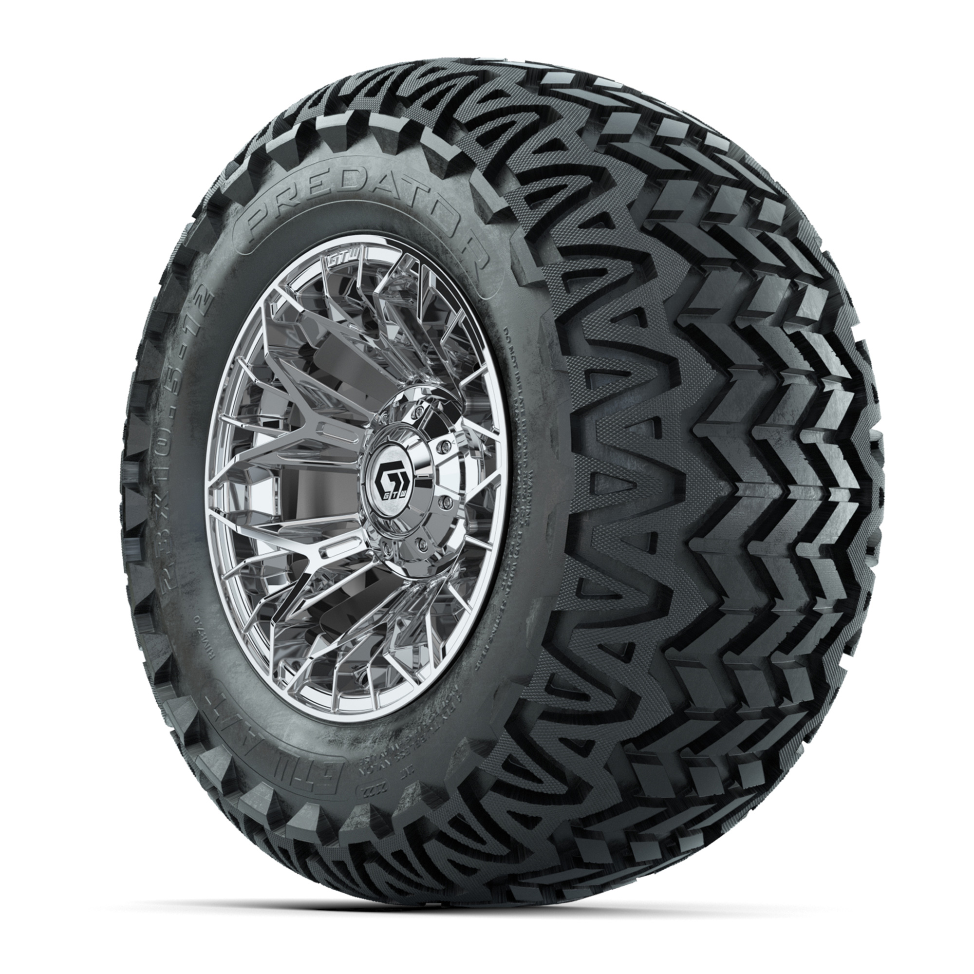 A set of (4) 12-inch GTW® Stellar Chrome golf cart wheels on 23x10.5-12 GTW® Predator All-Terrain Tires