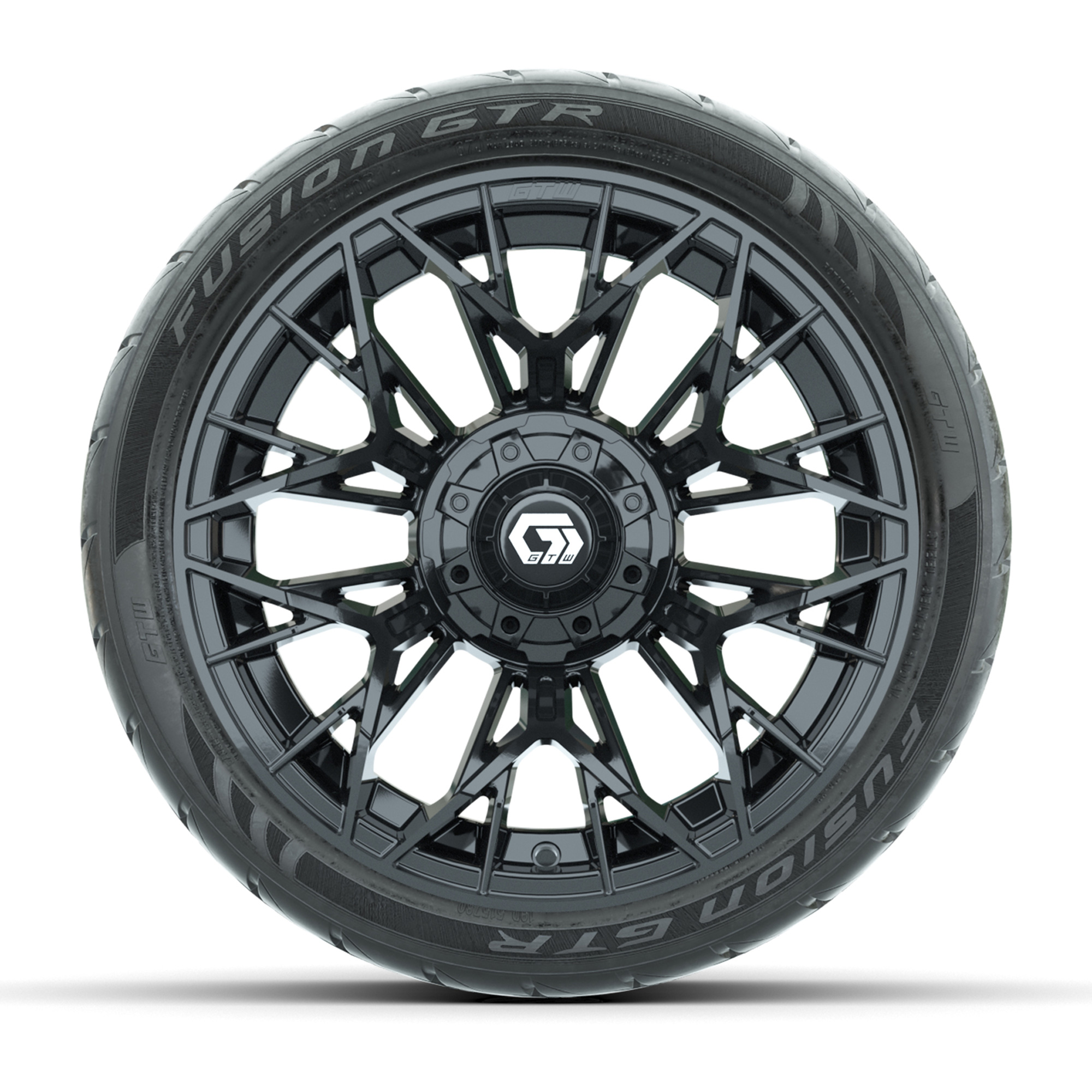 A set of (4) 14-inch GTW® Stellar Matte Black golf cart wheels on 205/40-R14 GTW® Fusion GTR Steel Belted Street Tires