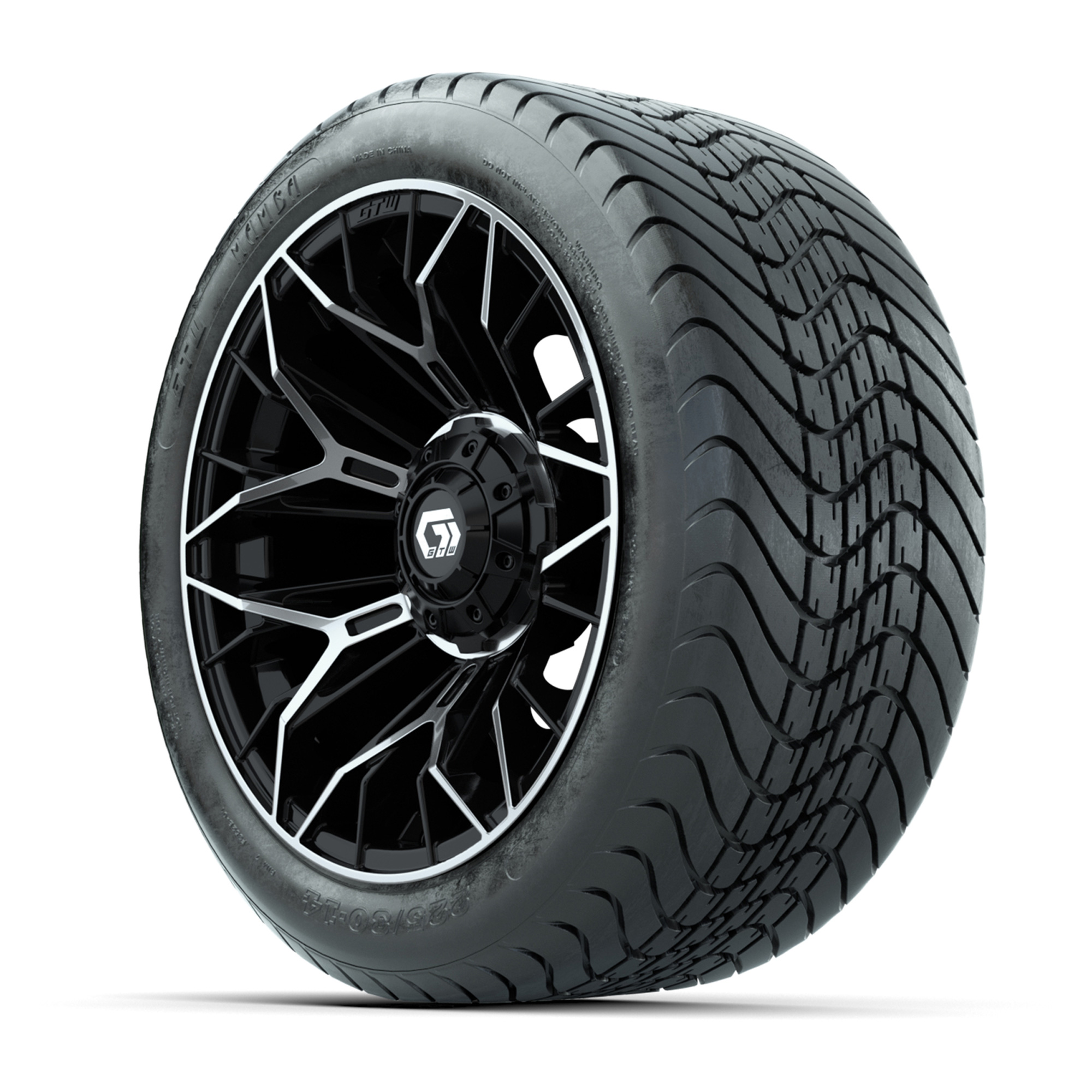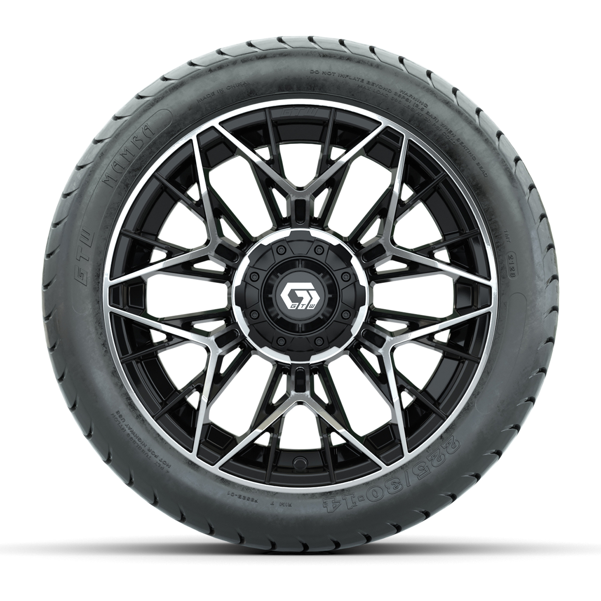 A set of (4) 14-inch GTW® Stellar machined face with black golf cart wheels on 225/30-14 GTW® Mamba Street Tires