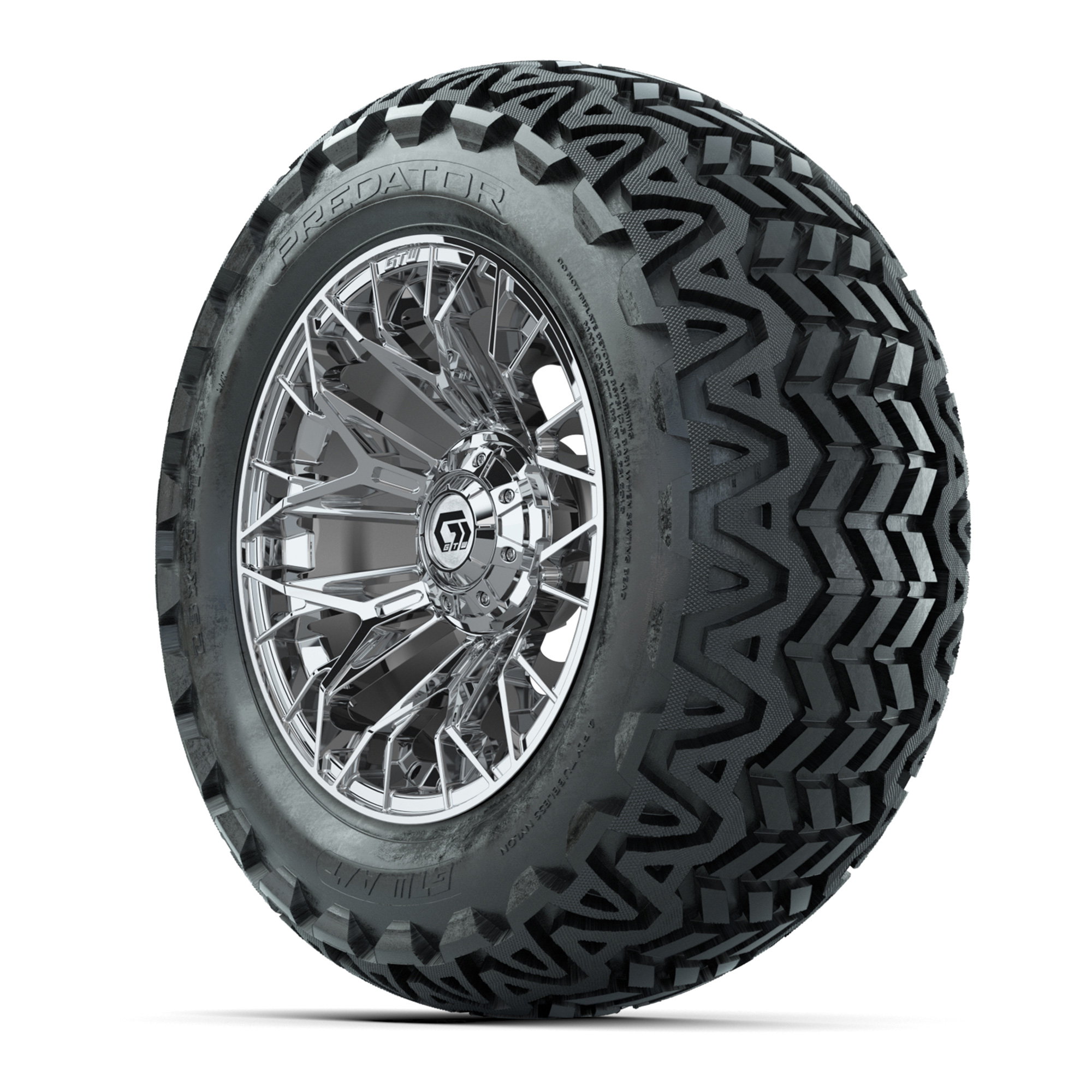 A set of (4) 14-inch GTW® Stellar Chrome golf cart wheels on 23x10-14 GTW® Predator All-Terrain Tires