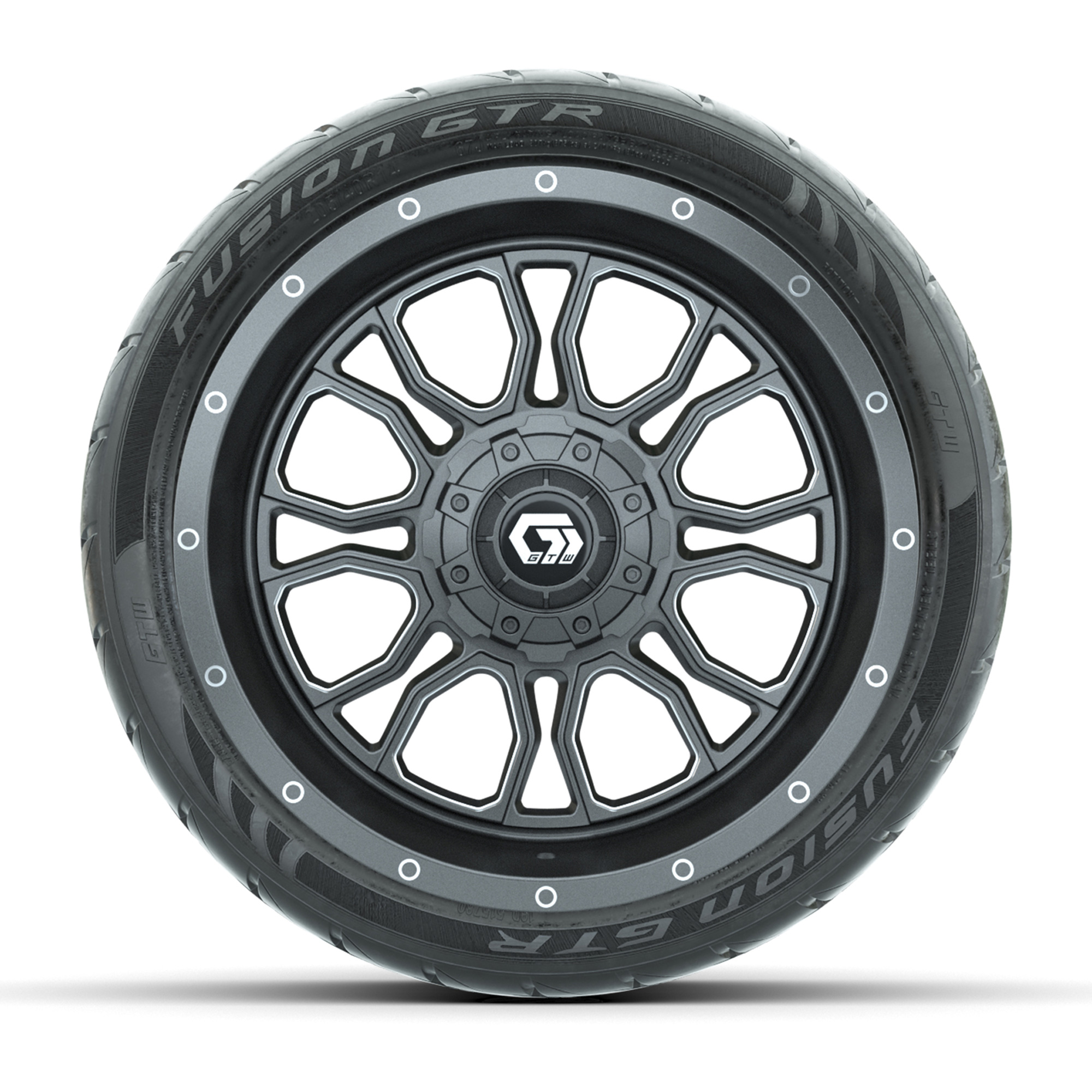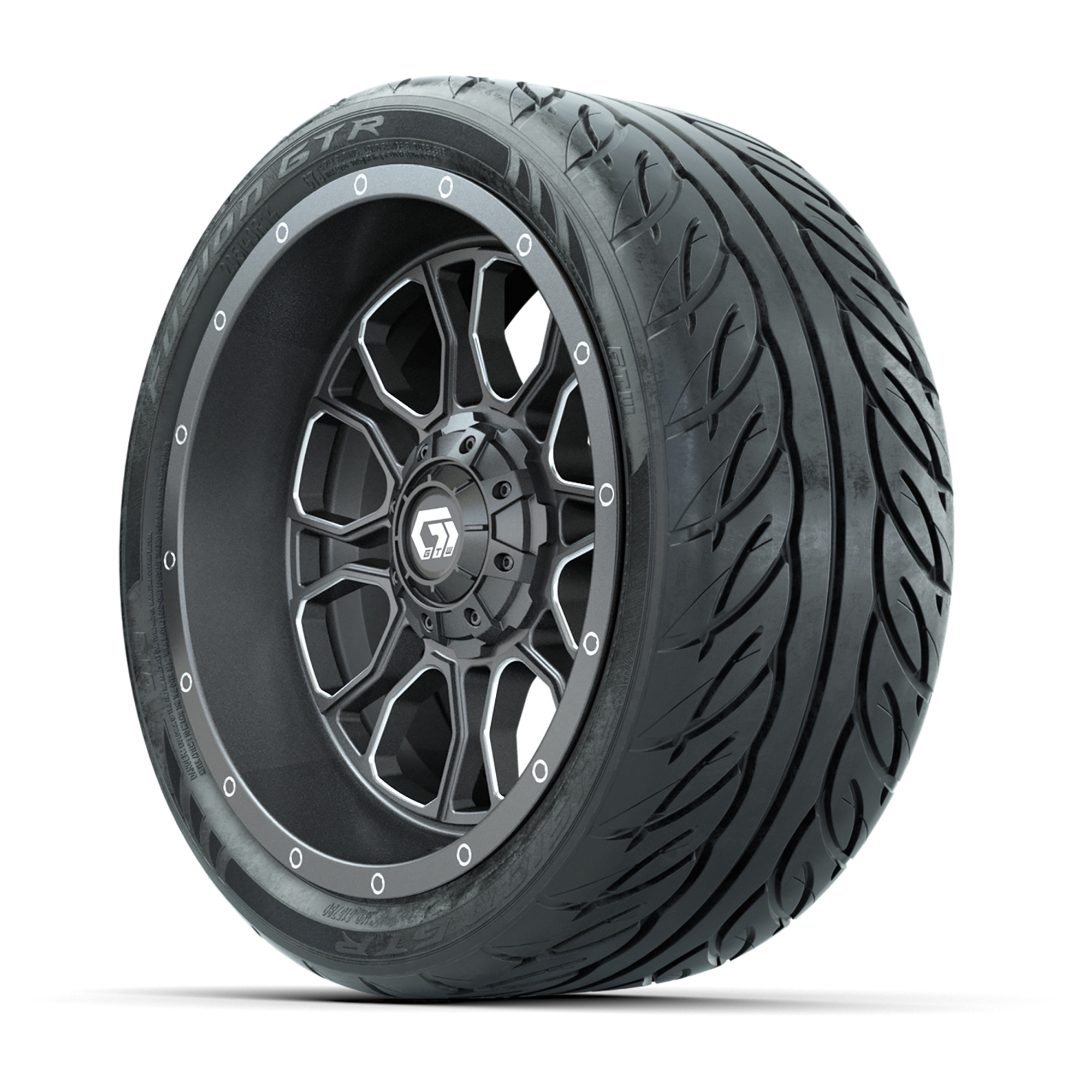 A set of (4) 14-inch GTW® Volt Gunmetal with Machined Accents golf cart wheels on 205/40-R14 GTW® Fusion GTR Steel Belted Street Tires