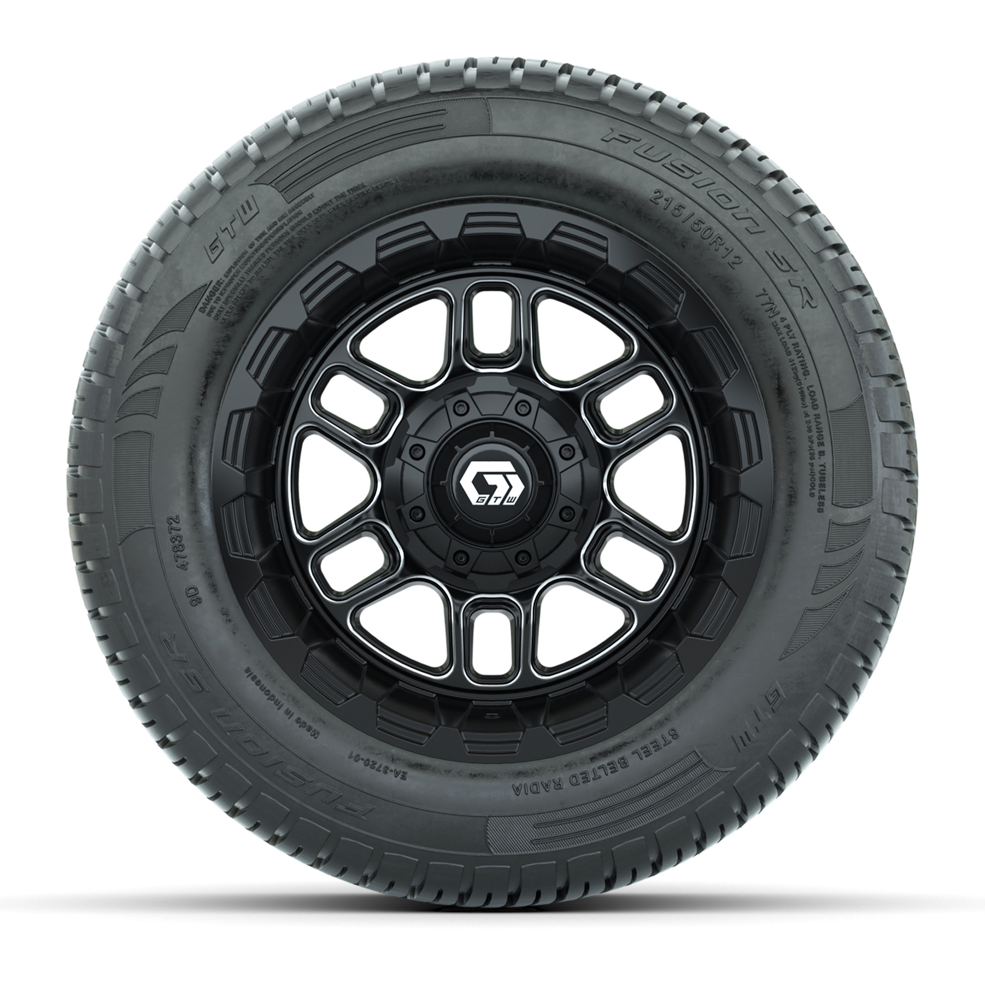 A set of (4) 12-inch GTW® Titan machined face with black golf cart wheels on 215/50-R12 GTW® Fusion S/R Steel Belted Street Tires