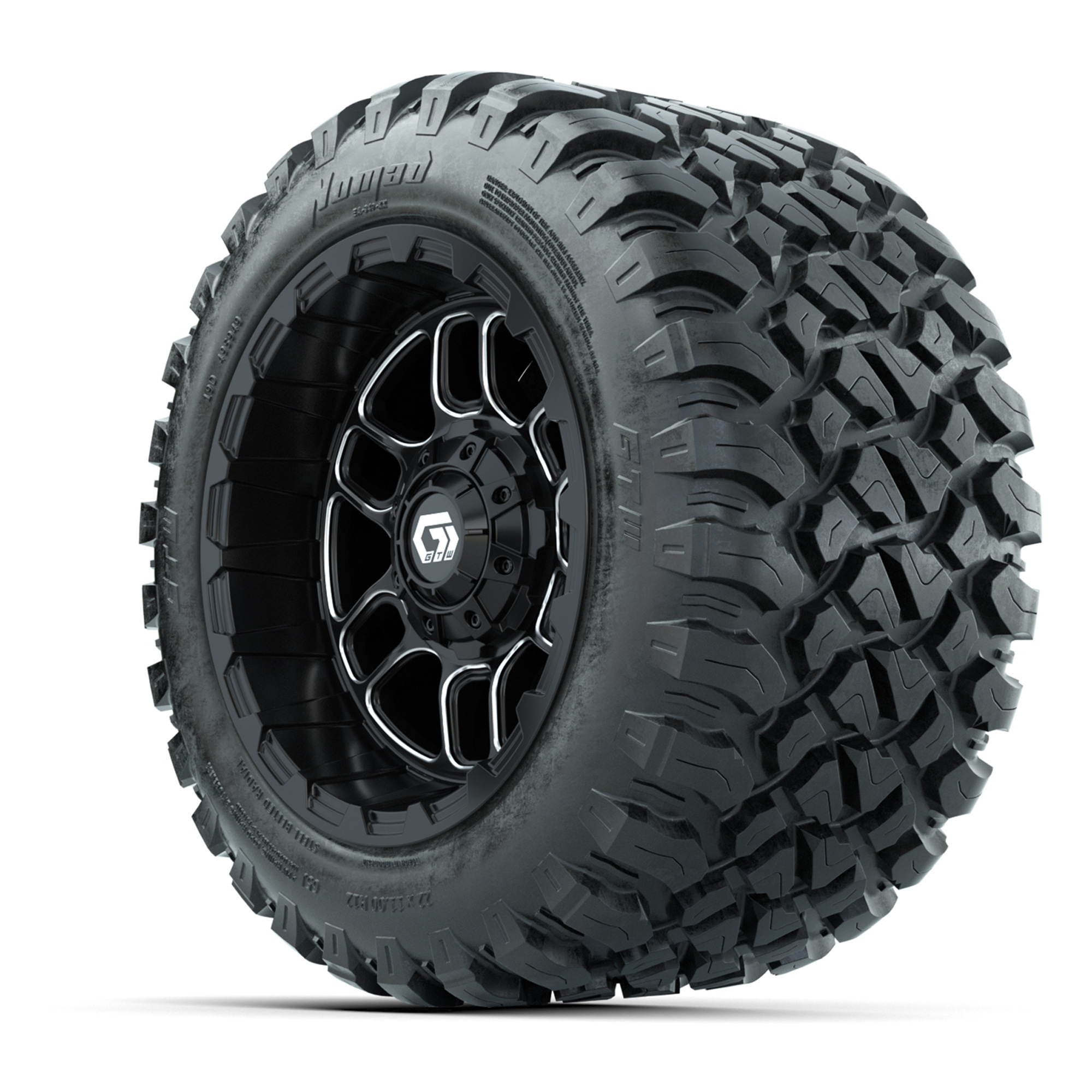 A set of (4) 12-inch GTW® Titan machined face with black golf cart wheels on 22x11-R12 GTW® Nomad Steel Belted All-Terrain Tires