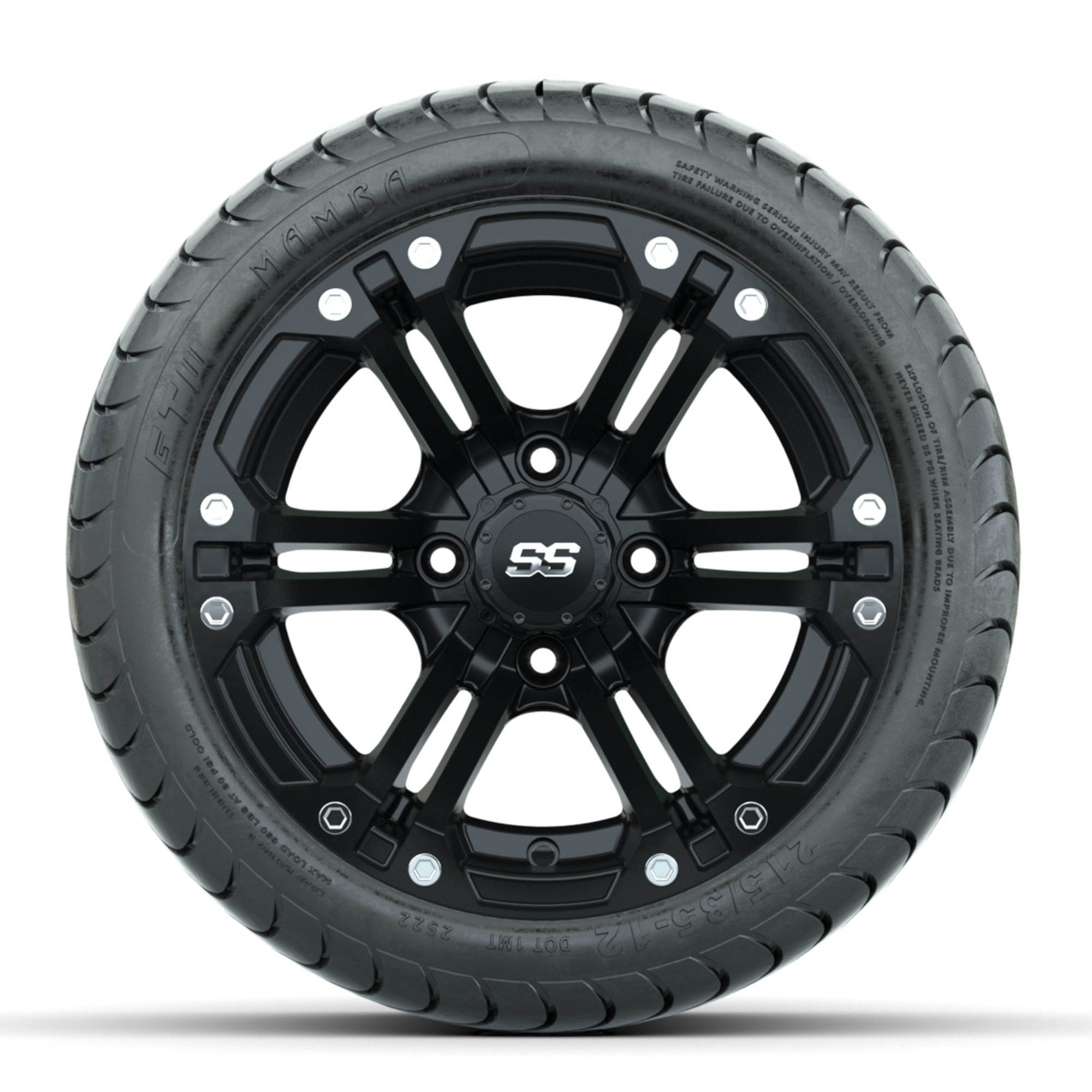 product GTW Specter Matte Black 12 in Wheels with 215/35-12 Mamba Street Tires – Full Set Item # A19-836 A set of (4) 12-inch GTW® Specter Matte Black golf cart wheels Mounted on 215/35-12 GTW® Mamba Street TiresTread Classification:Course / StreetFull Tire & Wheel Combo Includes:(4) 12x7 GTW® Specter Wheels / Matte Black finish / Offset: 3:4 (ET -.25)(4) 215/35-12 GTW® Mamba Street Tires / Tire is approx. 18” tall (4-Ply)(4) Center capsPlease Note: All Wheels are 4 on 4 Hole / Lug Pattern unless otherwise specified.Tech Tips:This Tire & Wheel Combo Does Not Require a Lift Kit Please Check and Adjust PSI in Tires Before Operation (Recommended Inflation Can Be Found on Sidewall of Tire)Tire & Wheel Combos are mounted and Inflated Before Shipping, Free of Charge All Wheels Have a lug pattern of "4x101.6mm"Lug Nuts Sold Separately: Standard Chrome Lug Nuts #LUG4SMetric Chrome Lug Nuts #LUG4M (Yamaha Models) Find A Dealer