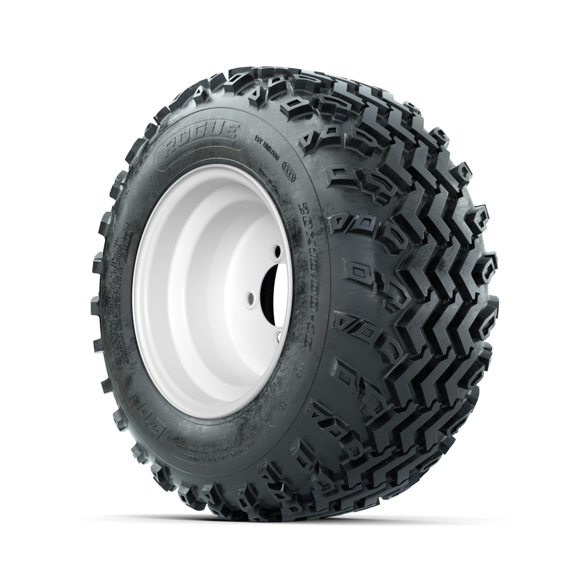 product GTW Steel White 10 in Wheels with 20x10.00-10 Rogue All Terrain Tires – Full Set Item # A19-919 A set of (4) 10-inch GTW® Steel White golf cart wheels Mounted on 20x10.00-10 Rogue All-Terrain TiresTread Classification:All-TerrainFull Tire & Wheel Combo Includes:(4) 10x7 GTW® Steel Wheels / White finish(4) 20x10.00-10 GTW Rogue All-Terrain Tires / Tire is approx. 20” tall (4-Ply)Reuse Stock LugsPlease Note: All Wheels are 4 on 4 Hole / Lug Pattern unless otherwise specified.Tech Tips:We Recommend a Minimum 3” Lift Kit for This Tire & Wheel Combo (Tire is approx. 20” OD)Please Check and Adjust PSI in Tires Before Operation (Recommended Inflation Can Be Found on Sidewall of Tire)Tire & Wheel Combos are mounted and Inflated Before Shipping, Free of Charge All Wheels Have a lug pattern of "4x101.6mm"Lug Nuts Sold Separately: Standard Chrome Lug Nuts #LUG4SMetric Chrome Lug Nuts #LUG4M (Yamaha Models) Find A Dealer