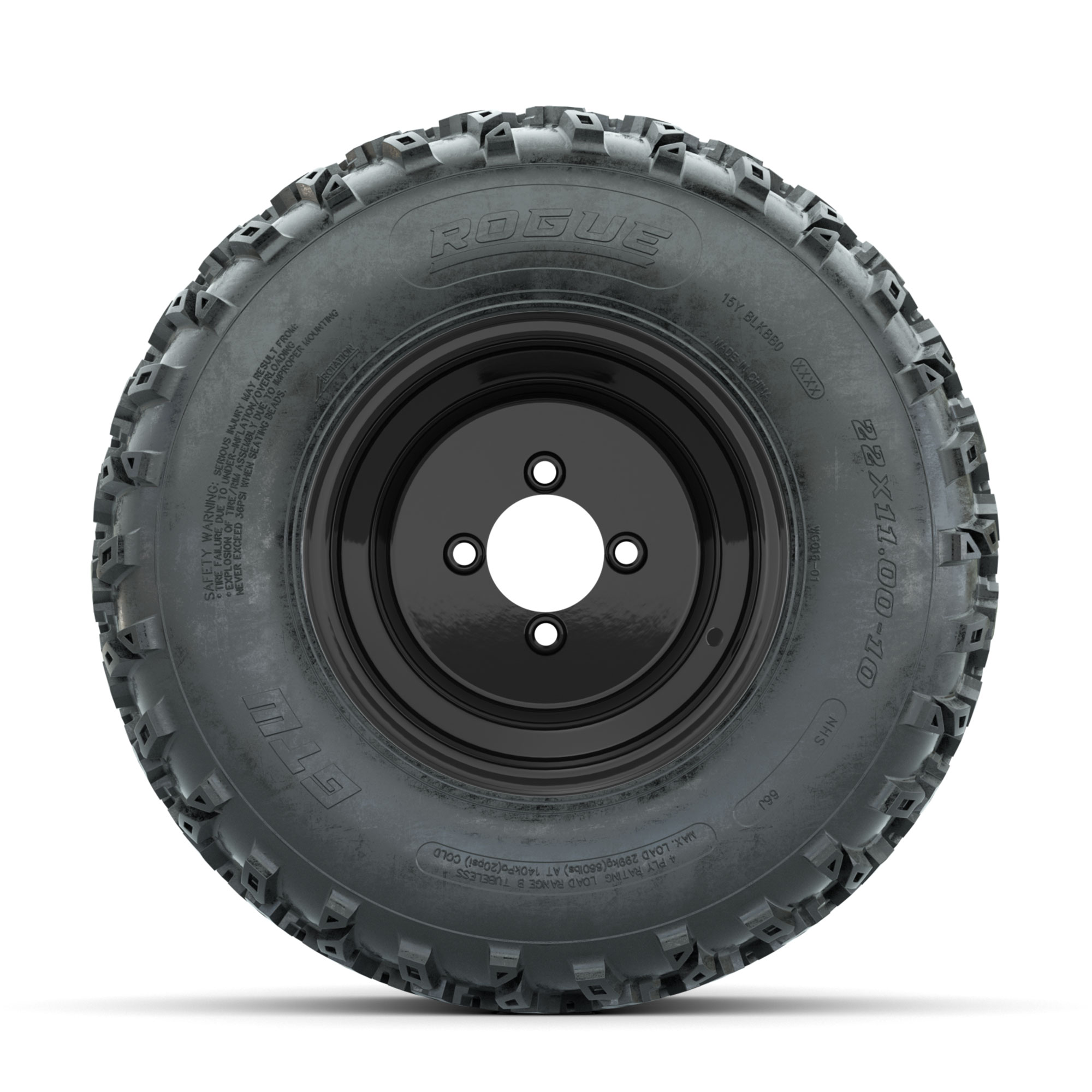 product GTW Steel Black 10 in Wheels with 22x11.00-10 Rogue All Terrain Tires – Full Set Item # A19-941 A set of (4) 10-inch GTW® Steel Black golf cart wheels Mounted on 22x11.00-10 Rogue All-Terrain TiresTread Classification:All-TerrainFull Tire & Wheel Combo Includes:(4) 10x7 GTW® Steel Wheels / Black finish(4) 22x11.00-10 GTW Rogue All-Terrain Tires / Tire is approx. 22” tall (4-Ply)Reuse Stock LugsPlease Note: All Wheels are 4 on 4 Hole / Lug Pattern unless otherwise specified.Tech Tips:We Recommend a Minimum 3” Lift Kit for This Tire & Wheel Combo (Tire is approx. 22” OD)Please Check and Adjust PSI in Tires Before Operation (Recommended Inflation Can Be Found on Sidewall of Tire)Tire & Wheel Combos are mounted and Inflated Before Shipping, Free of Charge All Wheels Have a lug pattern of "4x101.6mm"Lug Nuts Sold Separately: Standard Chrome Lug Nuts #LUG4SMetric Chrome Lug Nuts #LUG4M (Yamaha Models) Find A Dealer