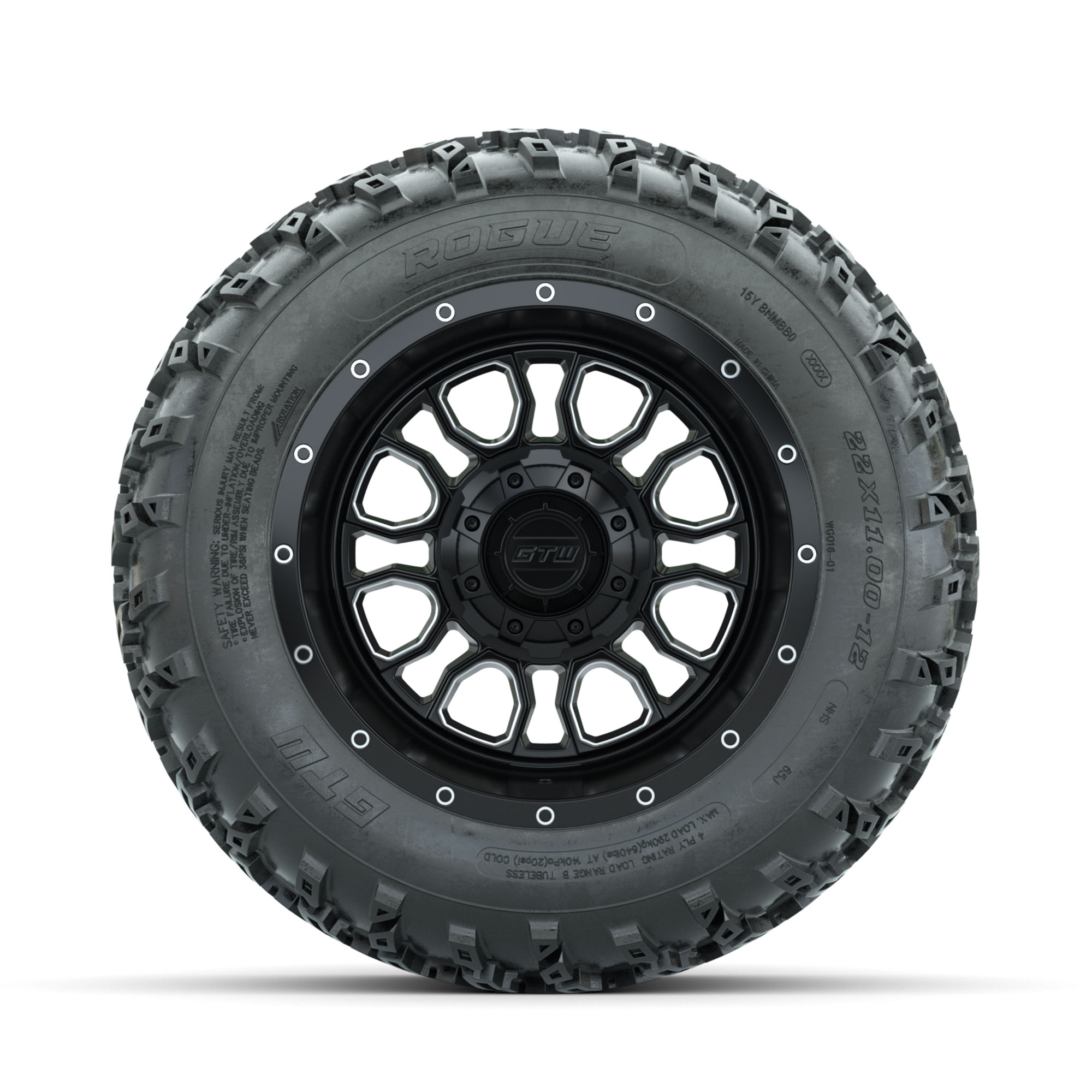 A set of (4) 12-inch GTW® Volt Machined/Black golf cart wheels Mounted on 22x11.00-12 Rogue All-Terrain Tires