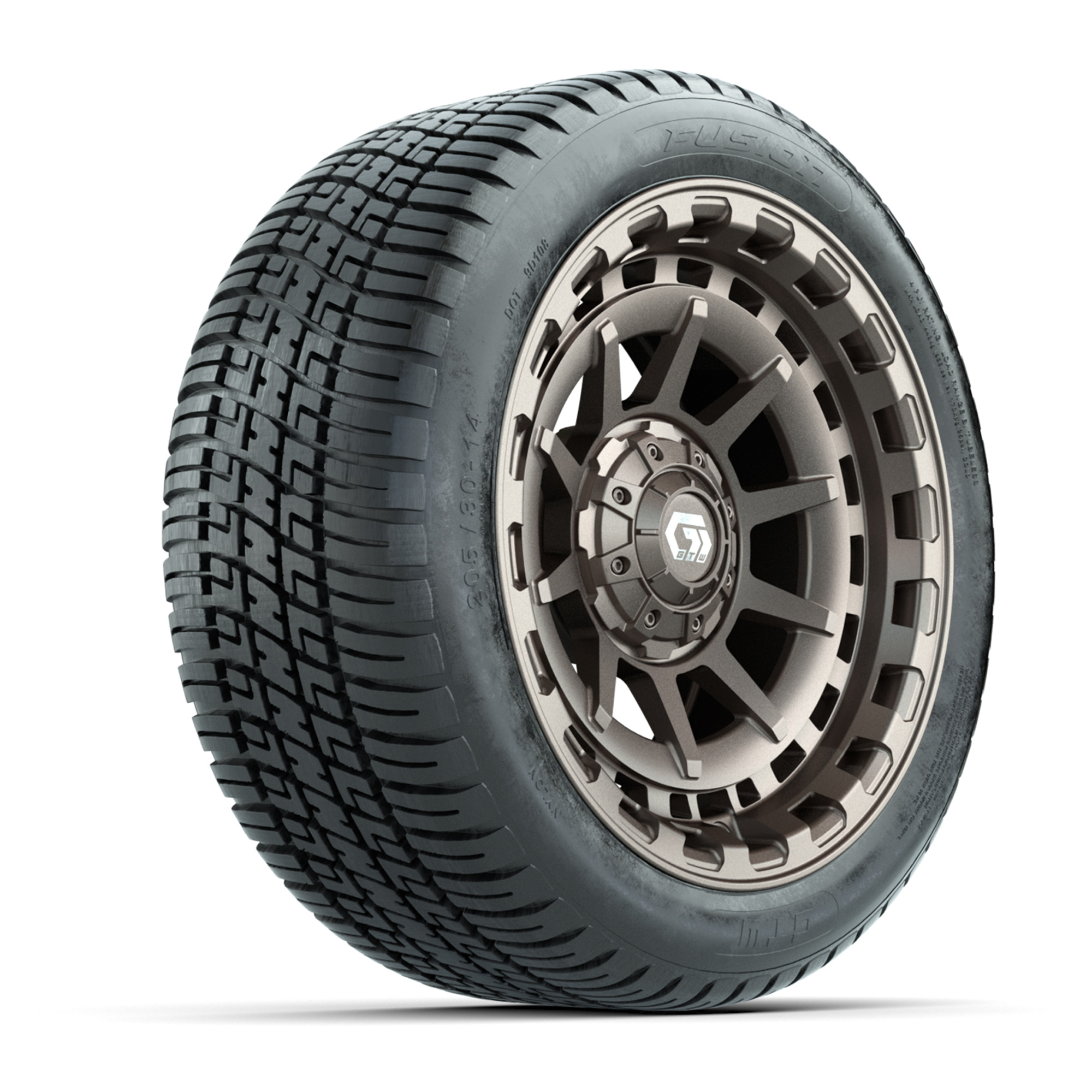 GTW® Barricade Satin Bronze 14 in Wheels with 205/40-R14 Fusion GTR Steel Belted Street Tires – Full Set