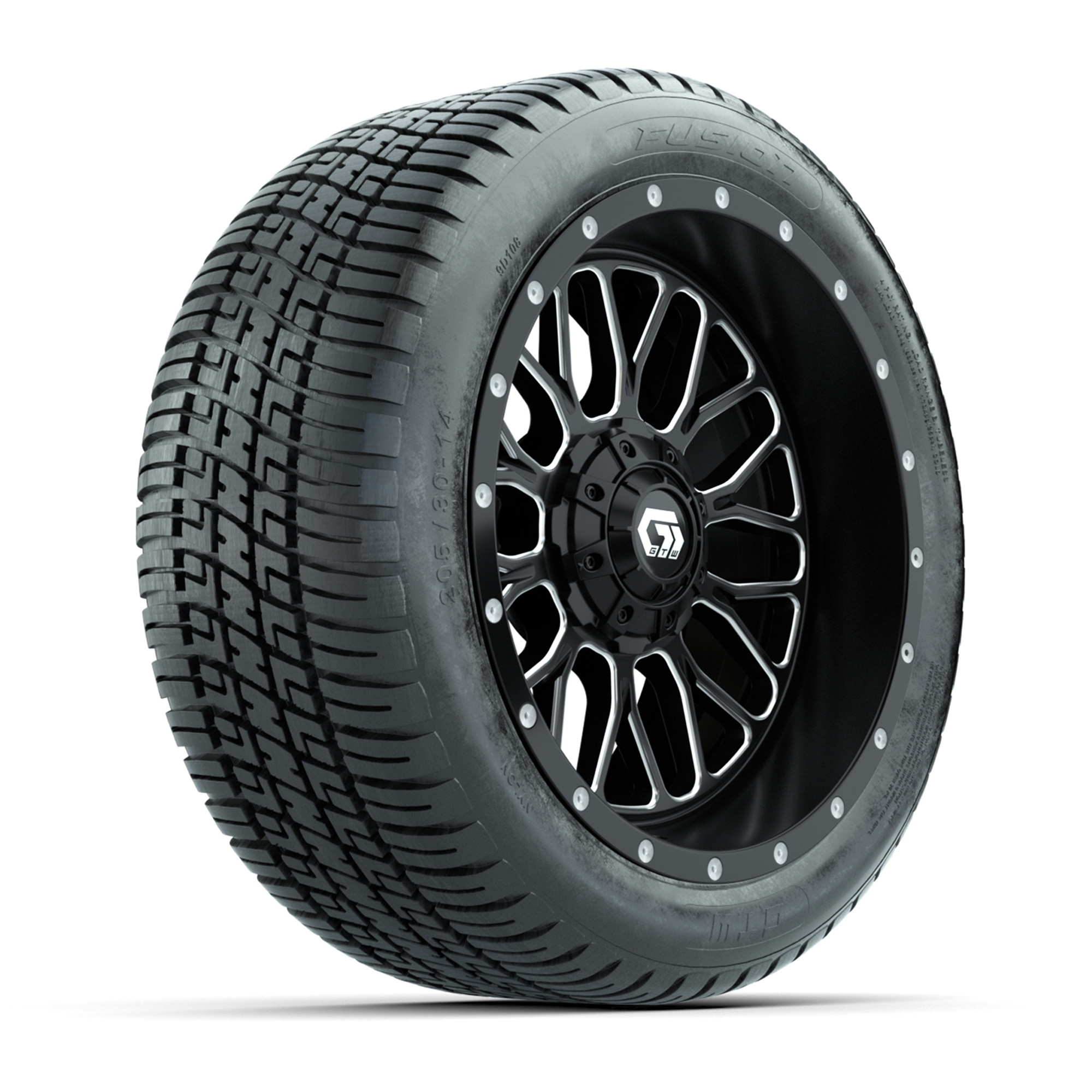 GTW® Helix Black/Machined 14 in Wheels with 205/30-R14 Fusion Street Tires – Full Set