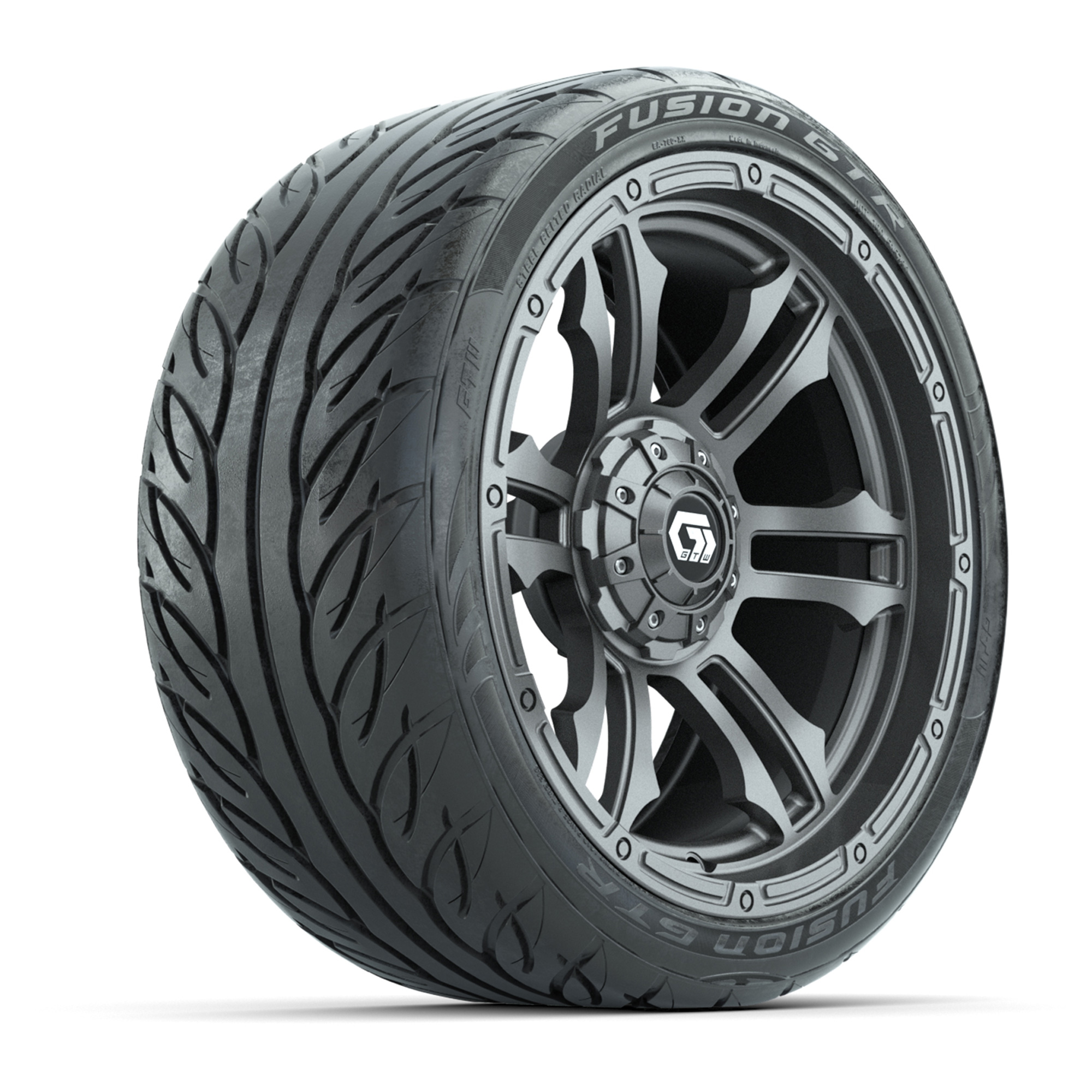 GTW® Spyder Matte Gray/Machined 12 in Wheels with 215/40-R12 Fusion GTR Steel Belt Radial Street Tires – Full Set